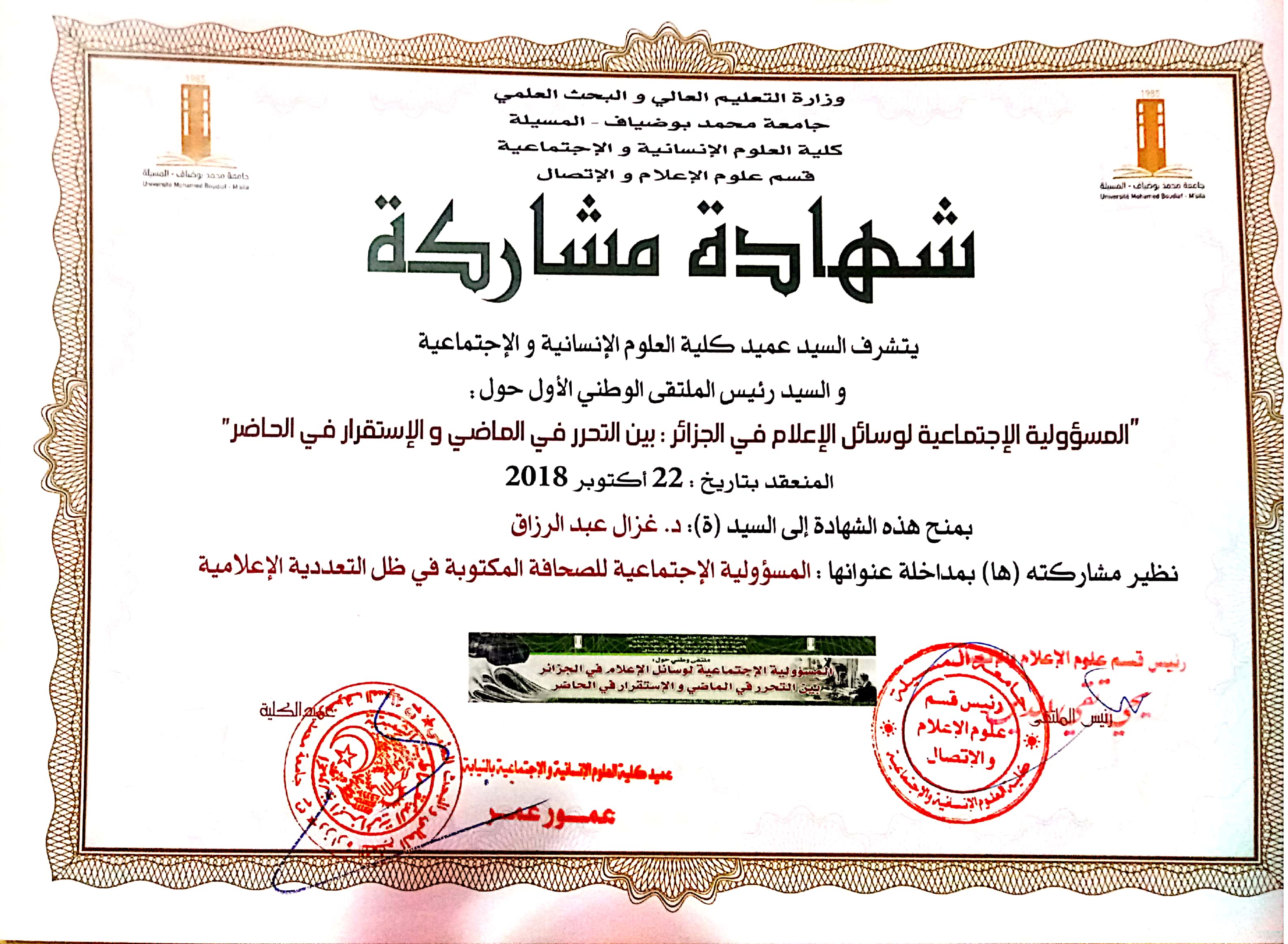 M. GHEZAL Abderrazzek, (2018), "المسؤولية الاجتماعية للصحافة المكتوبة في ظل التعددية الاعلامية", [national] المسؤولية الاجتماعية لوسائل الاعلام في الجزائر , جامعة المسيلة