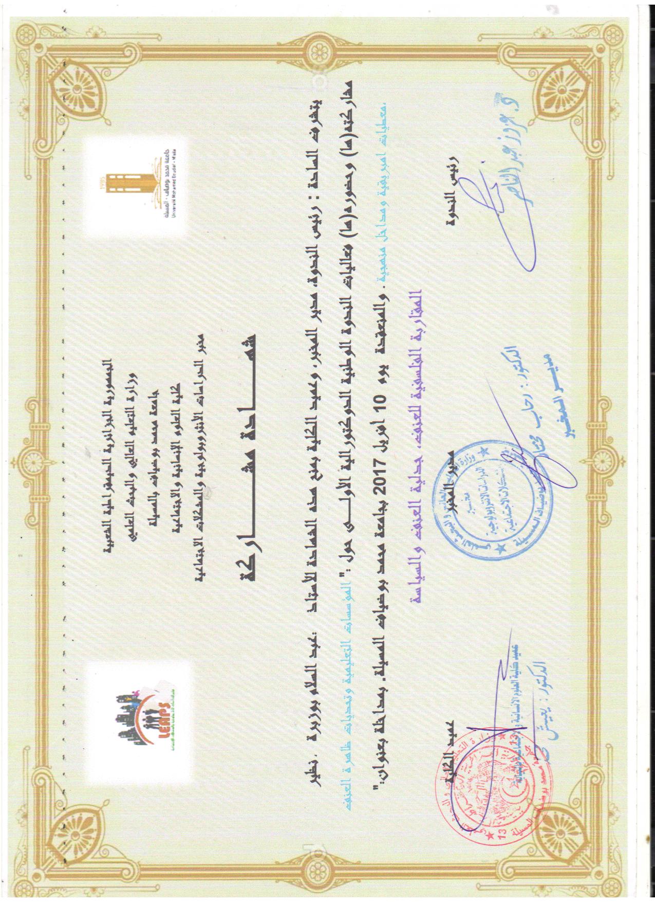 M. BOUZOBRA Abdeslem, (2015), "رئيس الجلسة الأولى", [international] الفلسفة والمواطنة , كلية العلوم الإنسانية والاجتماعية جامعة المسيلة