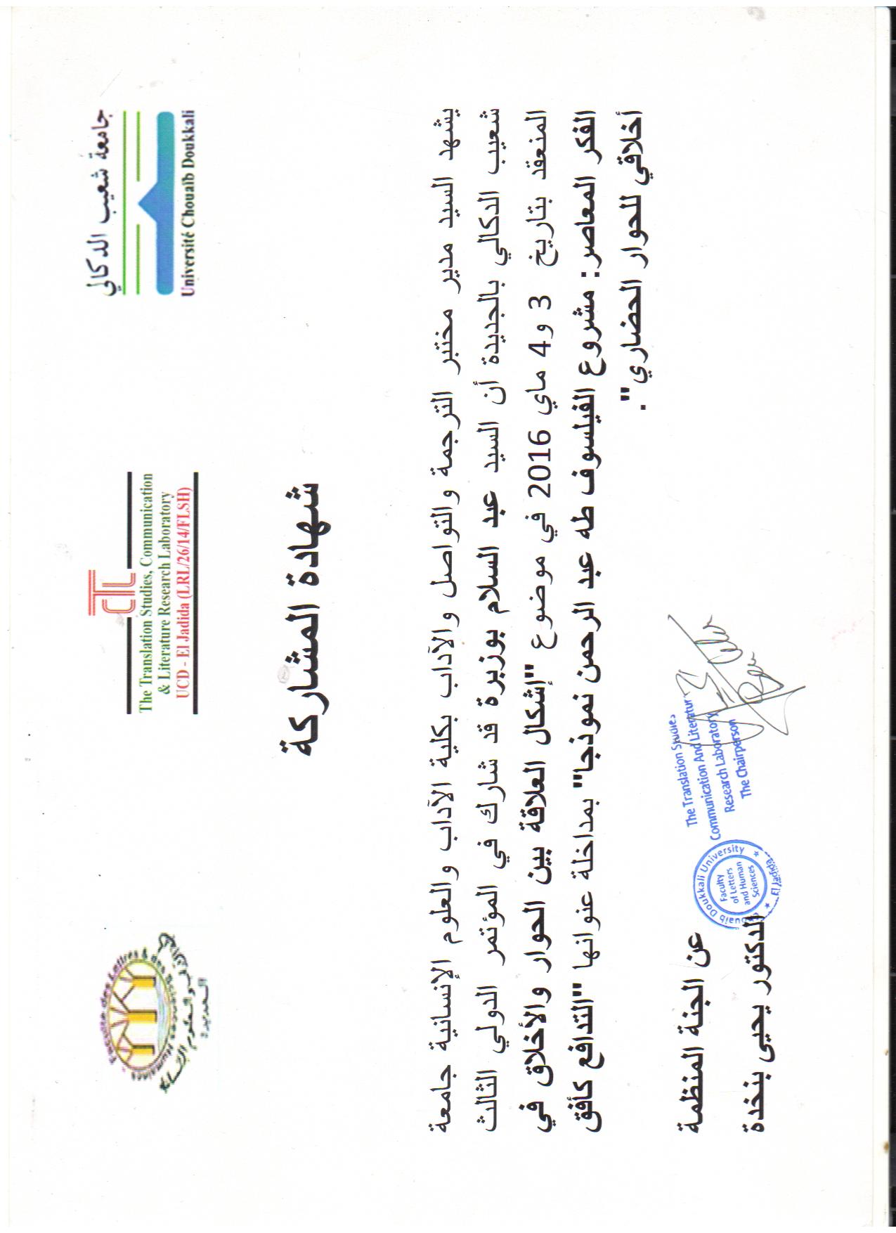 M. BOUZOBRA Abdeslem, (2016), "التدافع كأفق أخلاقي للحوار الحضاري", [international] إشكالية العلاقة بين الحوار والأخلاق في الفكر المعاصر: مشروع الفيلسوف طه عبد الرحمان , جامعة شعيب الدكالي المملكة المغربية