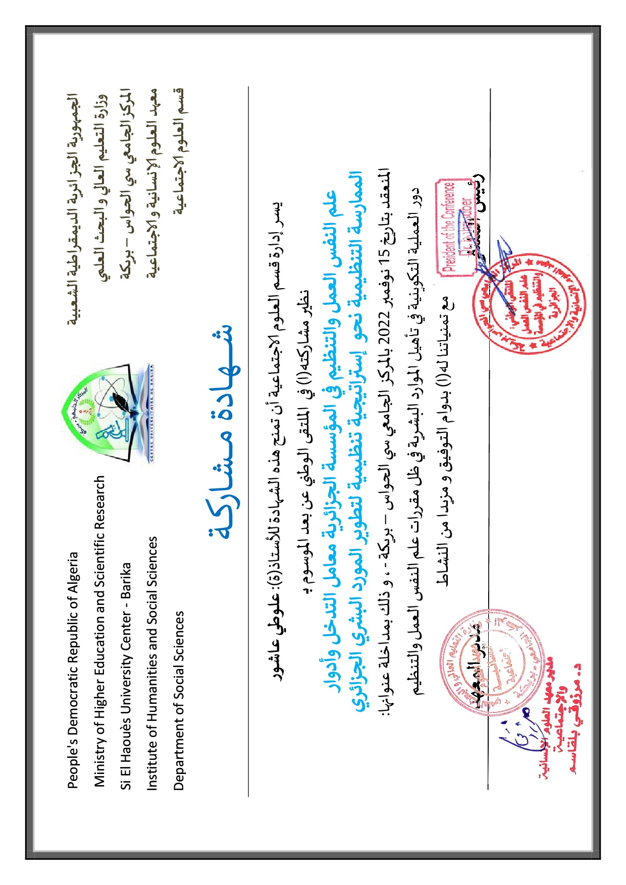 M. ALLOUTI Achour, (2022-11-15), "دور العملية التكوينية في تأهيل الموارد البشرية في ظل مقررات علم النفس العمل والتنظيم ".", [national] علم النفس العمل والتنظيم في المؤسسة الجزائرية معامل التدخل وأدوار الممارسة التنظيمية , المركز الجامعي بريكة