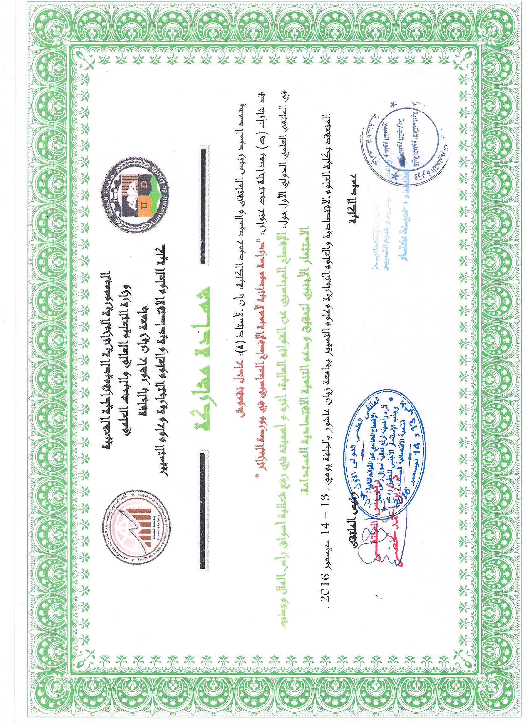 M. NAKMOUCHE Adel, (2016), "دراسة ميدانية لاهمية الافصاح المحاسبي في بورصة الجزائر", [international] الافصاح المحاسبي عن القوائم المالية واثره واهميته في رفع كفاءة الاسواق راس المال وجذب الاستثمار الاجنبي , الجلفة