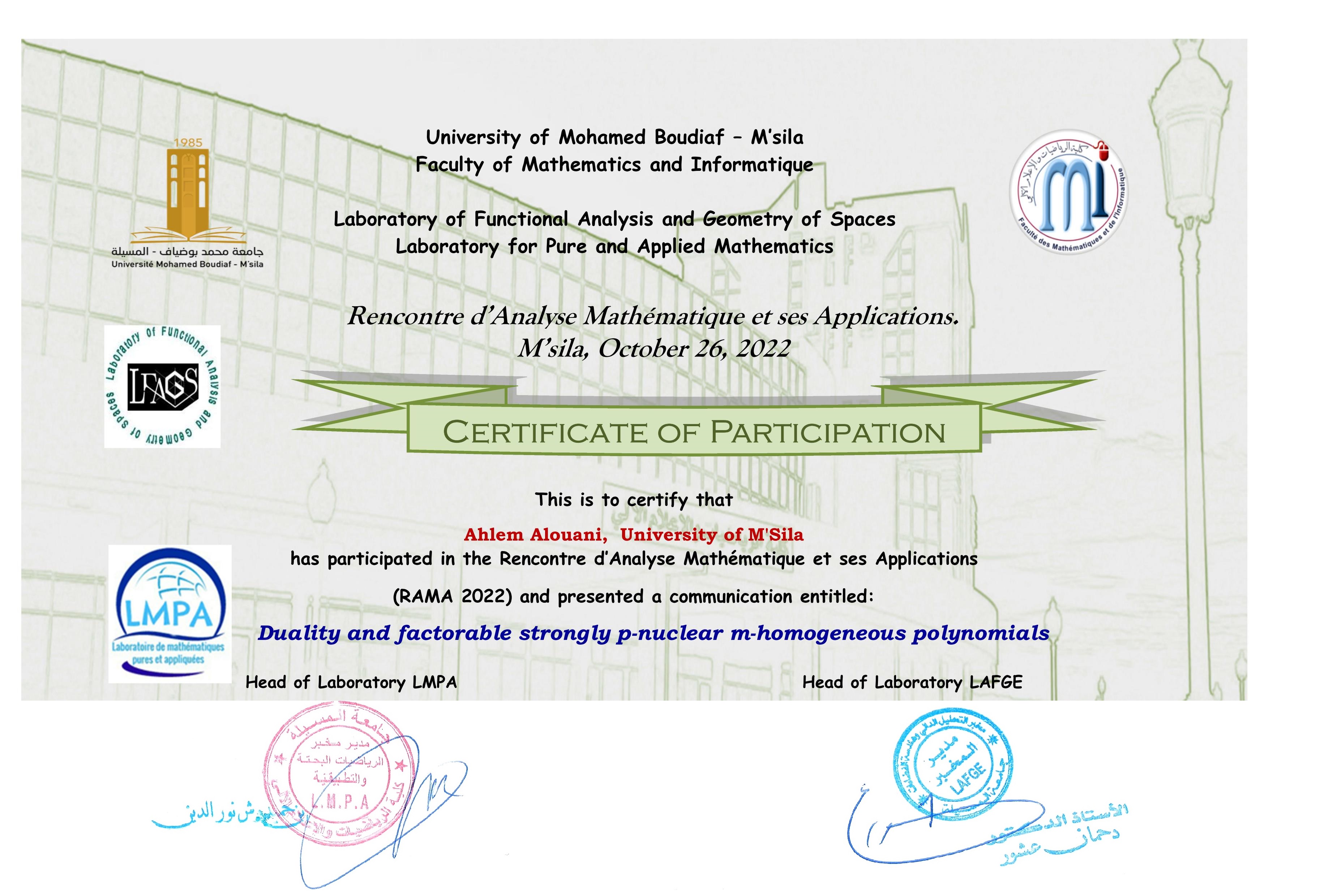 M. ALOUANI Ahlem, (2022), "Duality and factorable strongly p-nuclear m-homogeneous polynomials", [national] Rencontre d’Analyse Mathématique et ses Applications , Université de M’sila