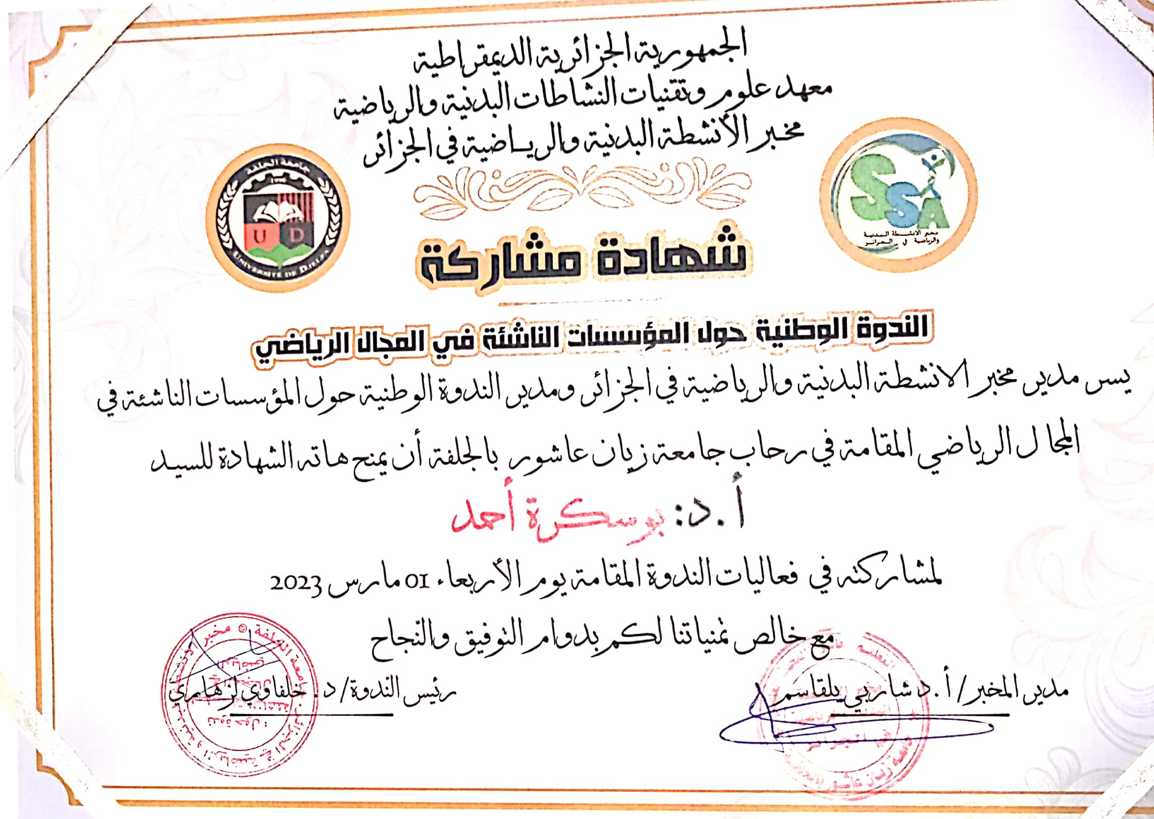 M. BOUSEKRA Ahmed, (2023-03-09), "فض النزاعات في المنظومة الريالضية الجزائرية", [international] الجديد في القانون الرياضي , جامعة المنار تونس