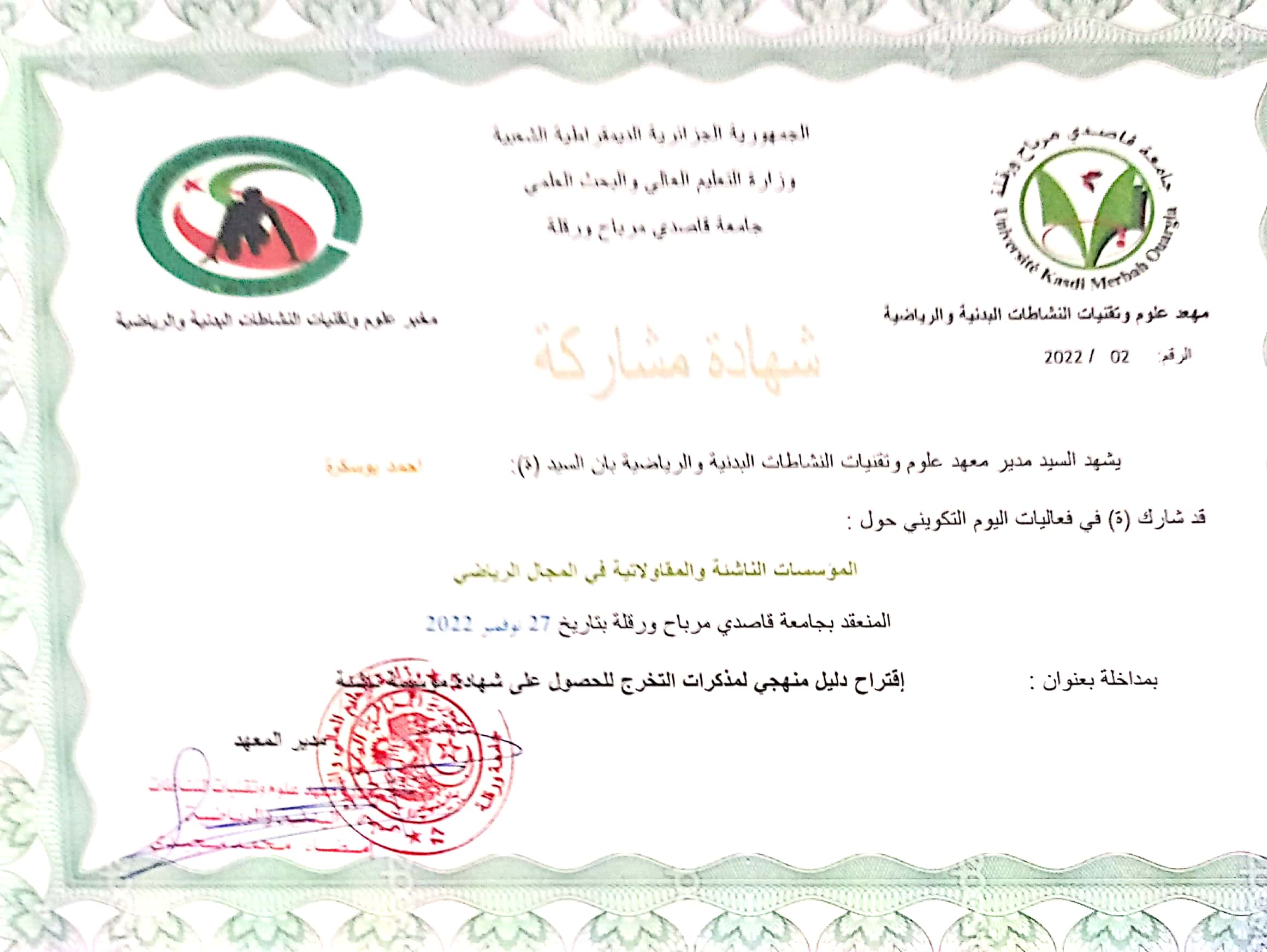 M. BOUSEKRA Ahmed, (2024-03-02), "المؤسسات الناشئة في الميدان الرياضي "نحو بيئة للاستثمار الرياضي في الجزائر"", [national] كيف تعد مشروعا مبتكرا من الفكرة الى التجسيد ؟ , 2جامعة سطيف