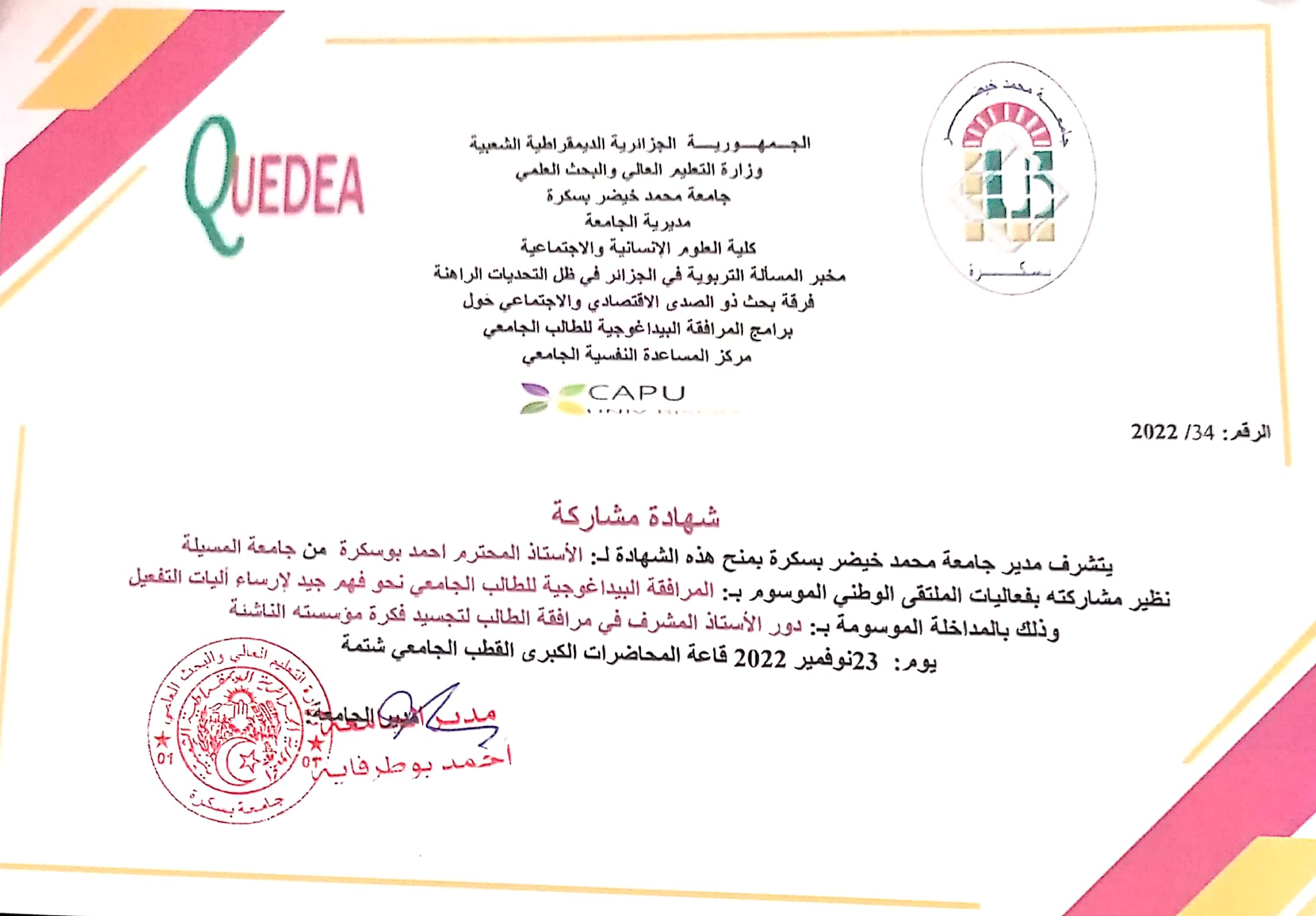 M. BOUSEKRA Ahmed, (2024-06-01), "المرافقة البيداغوجية للطالب الجامعي نحو فهم جيد لارساء اليات التفعيل", [national] , مخبر المسالة التربوية في الجزائر في ظل التحديات الراهنة