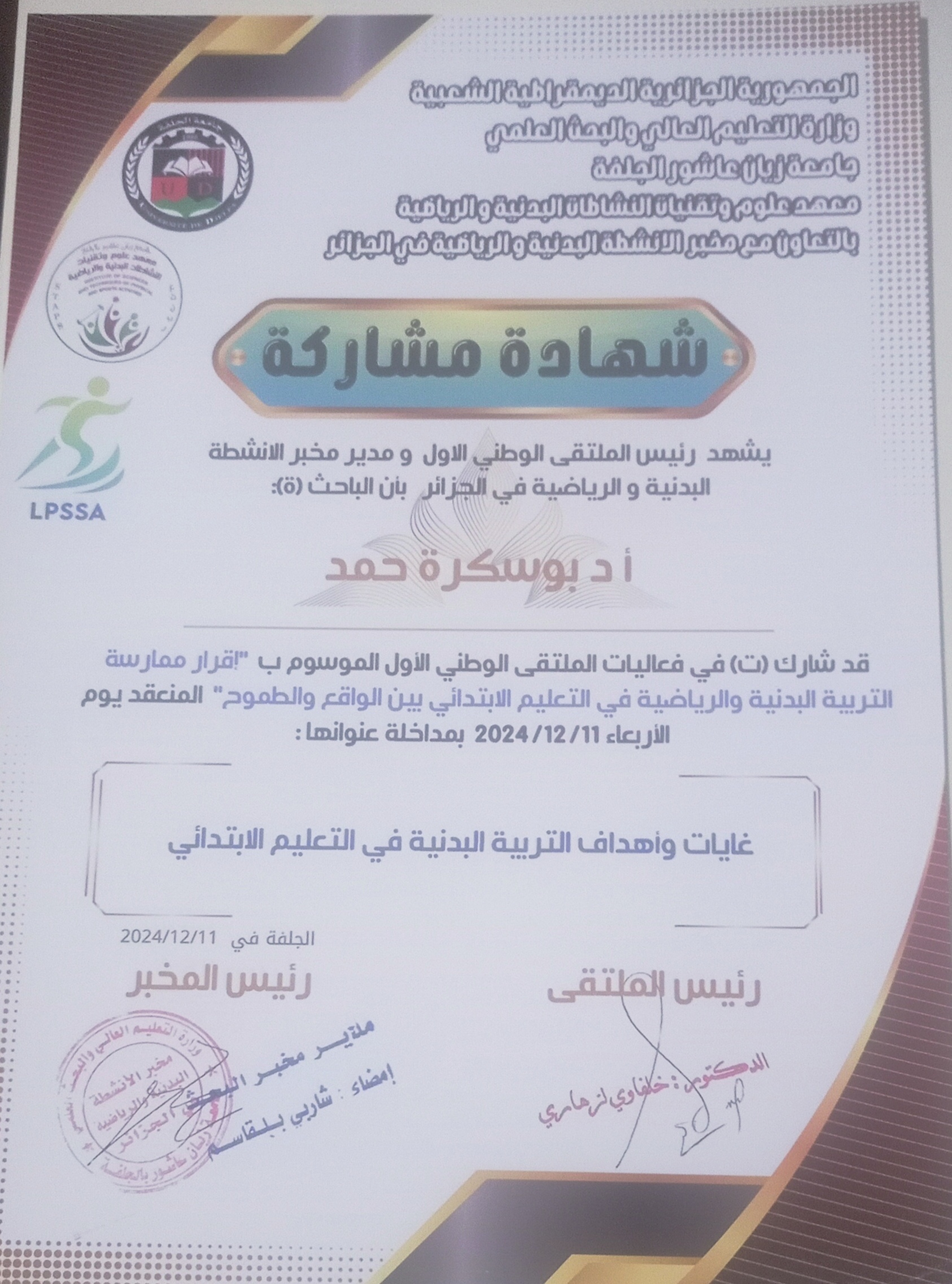 M. BOUSEKRA Ahmed, (2024-12-11), "غايات ممارسة التربية البدنية والرياضية في التعليم الابتدائي", [national] اقرار ممارسة التربية البدنية والر ياضية بين الواقع والطموح , جامعة الجلفة