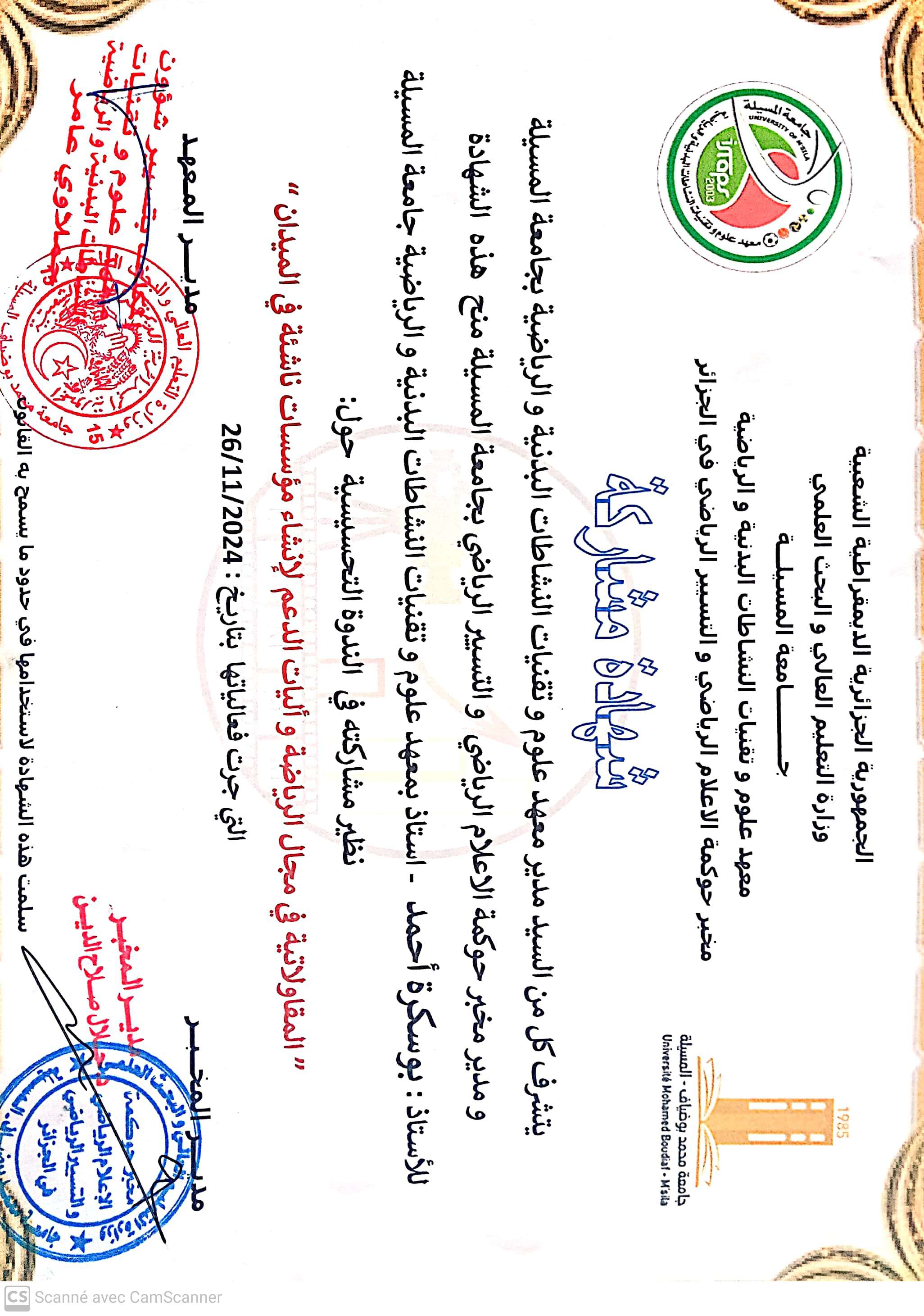 M. BOUSEKRA Ahmed, (2024-11-26), "المقاولاتية في المجال الرياضي", [national] المقاولاتية في المجال الرياضي , جامعة مسيلة