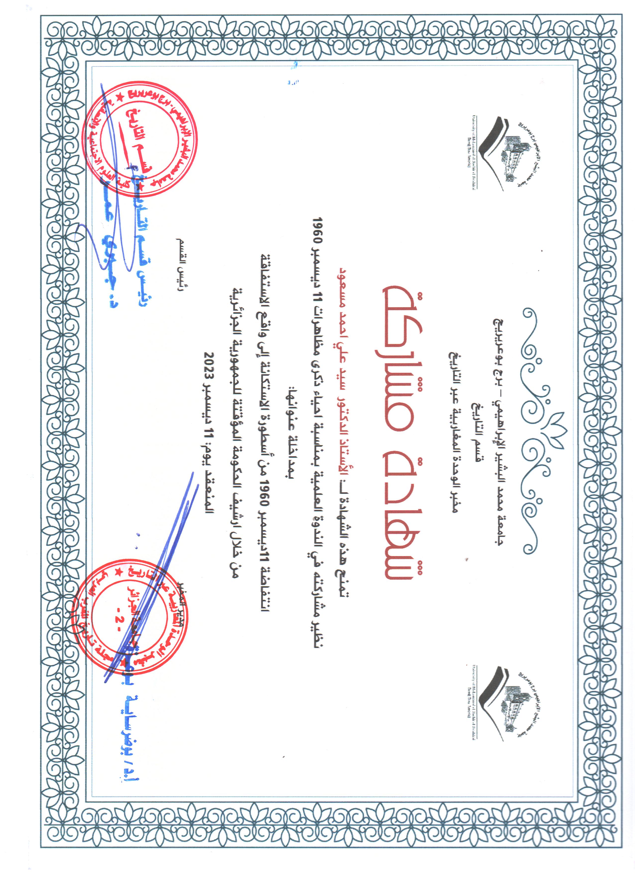 M. SIDALI Ahmedmessoud, (2023-12-11), "انتفاضة 11ديسمبر 1960 من اسطورة الاستكانة الى واقع الاستفاقة من خلال ارشيف الحكومة المؤقتة", [national] مظاهرا ت 11ديسمبر 1960 , جامعة برج بوعريريج الجزائر