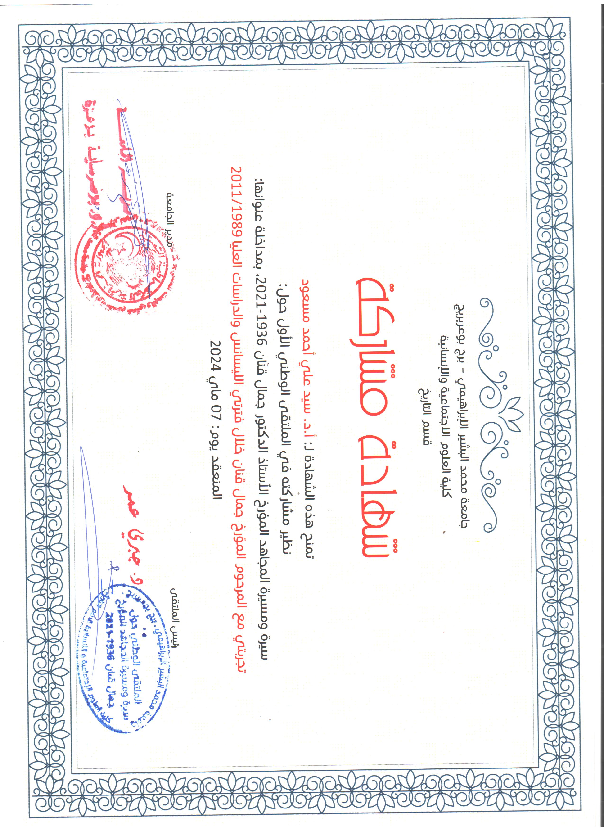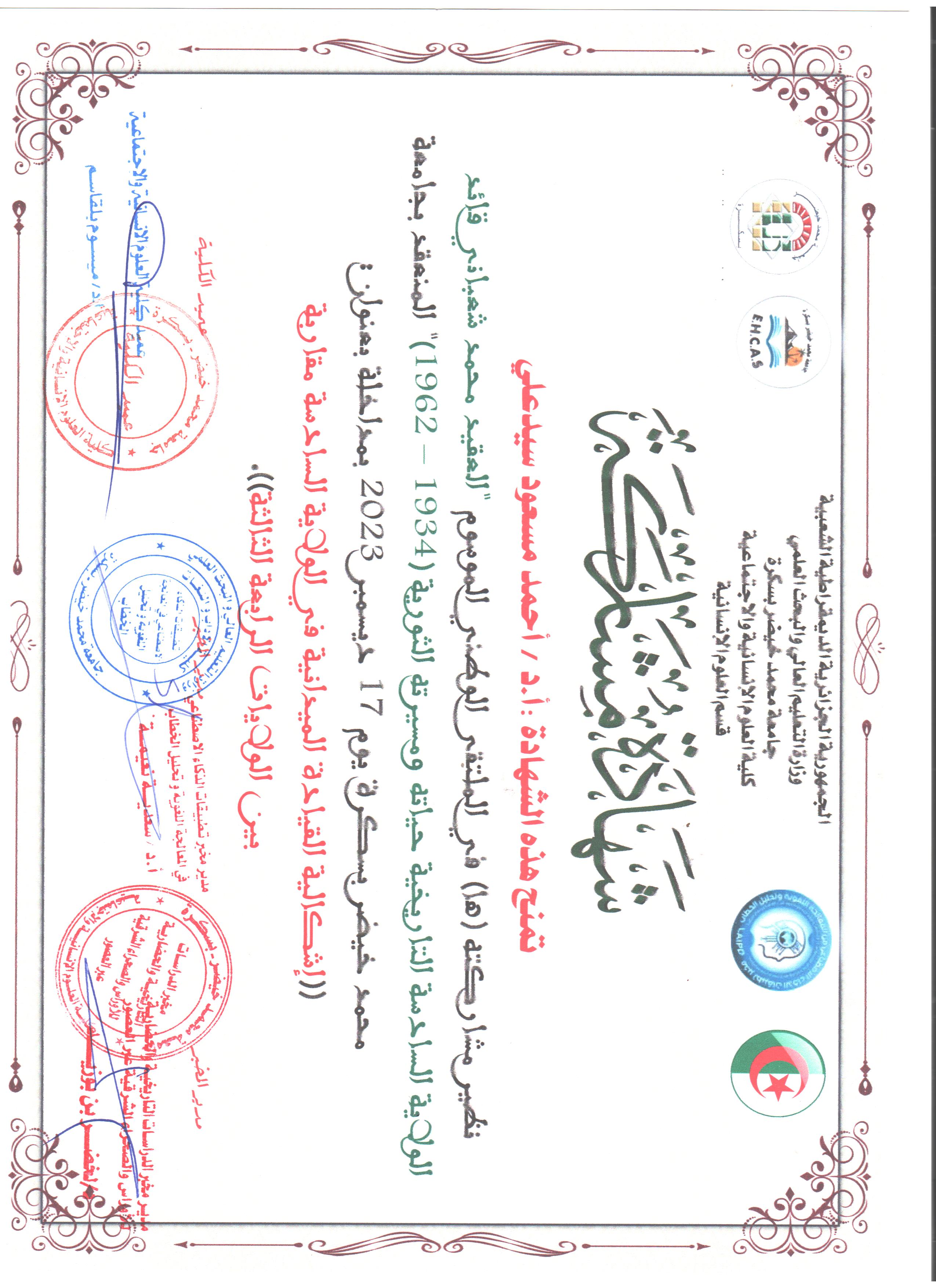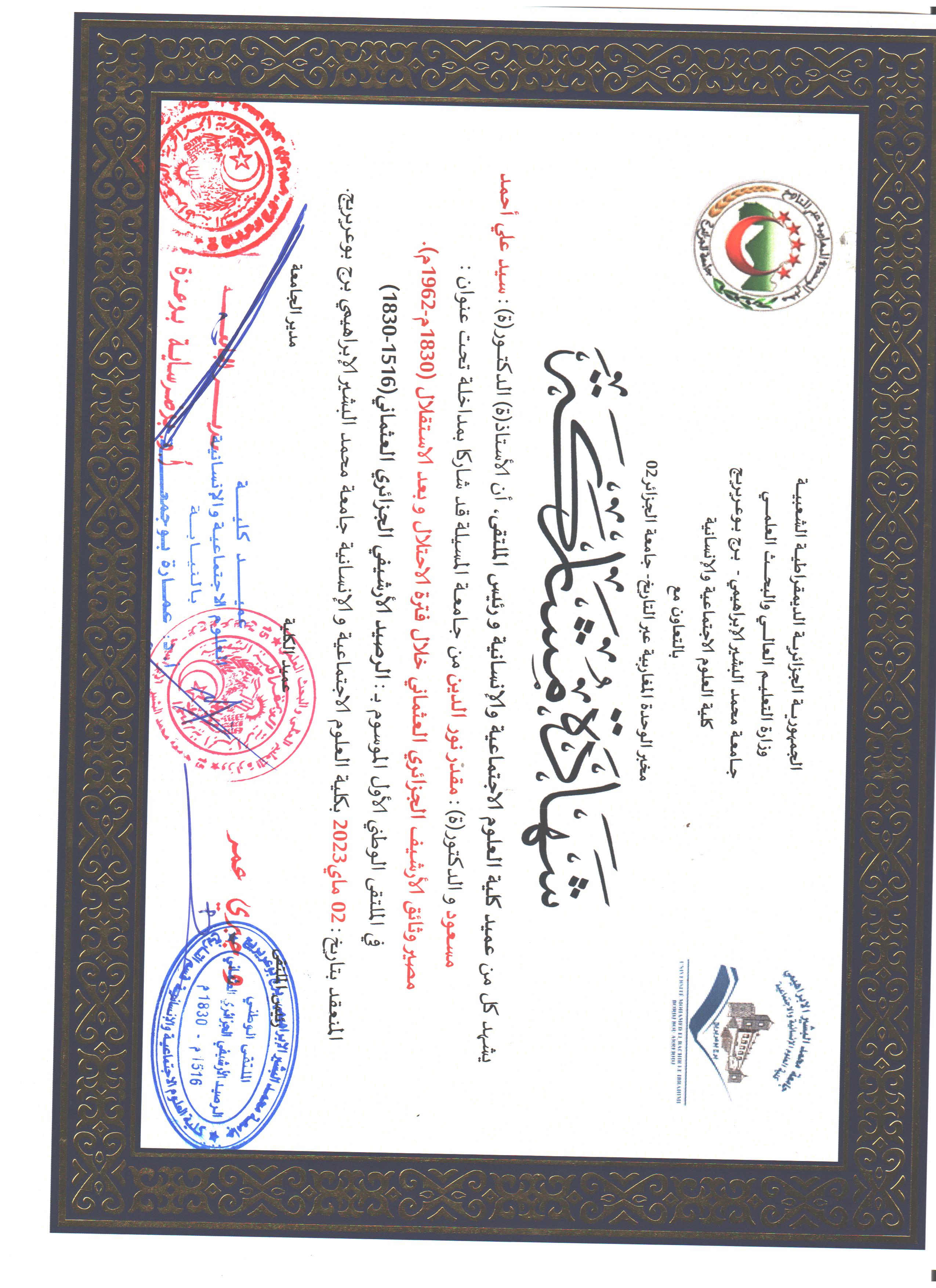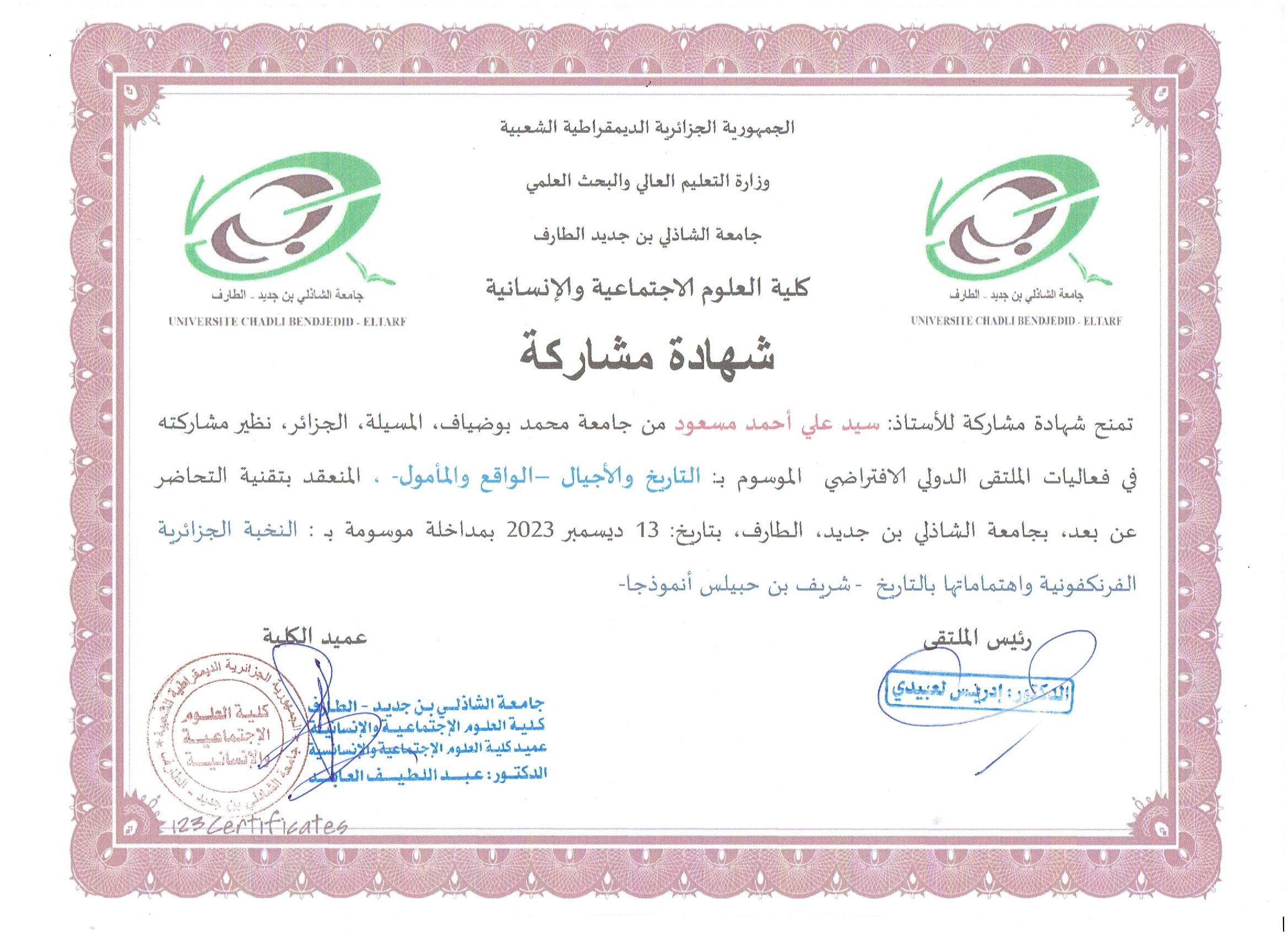 M. SIDALI Ahmedmessoud, (2023-12-13), "النخبة الجزائرية الفرنكوفونية واهتماماتها بالتاريخ شريف بن حبيلس نموذجا", [international] التاريخ والاجيال الواقع والمامول , جامعة شاذلي بن جديد الطارف