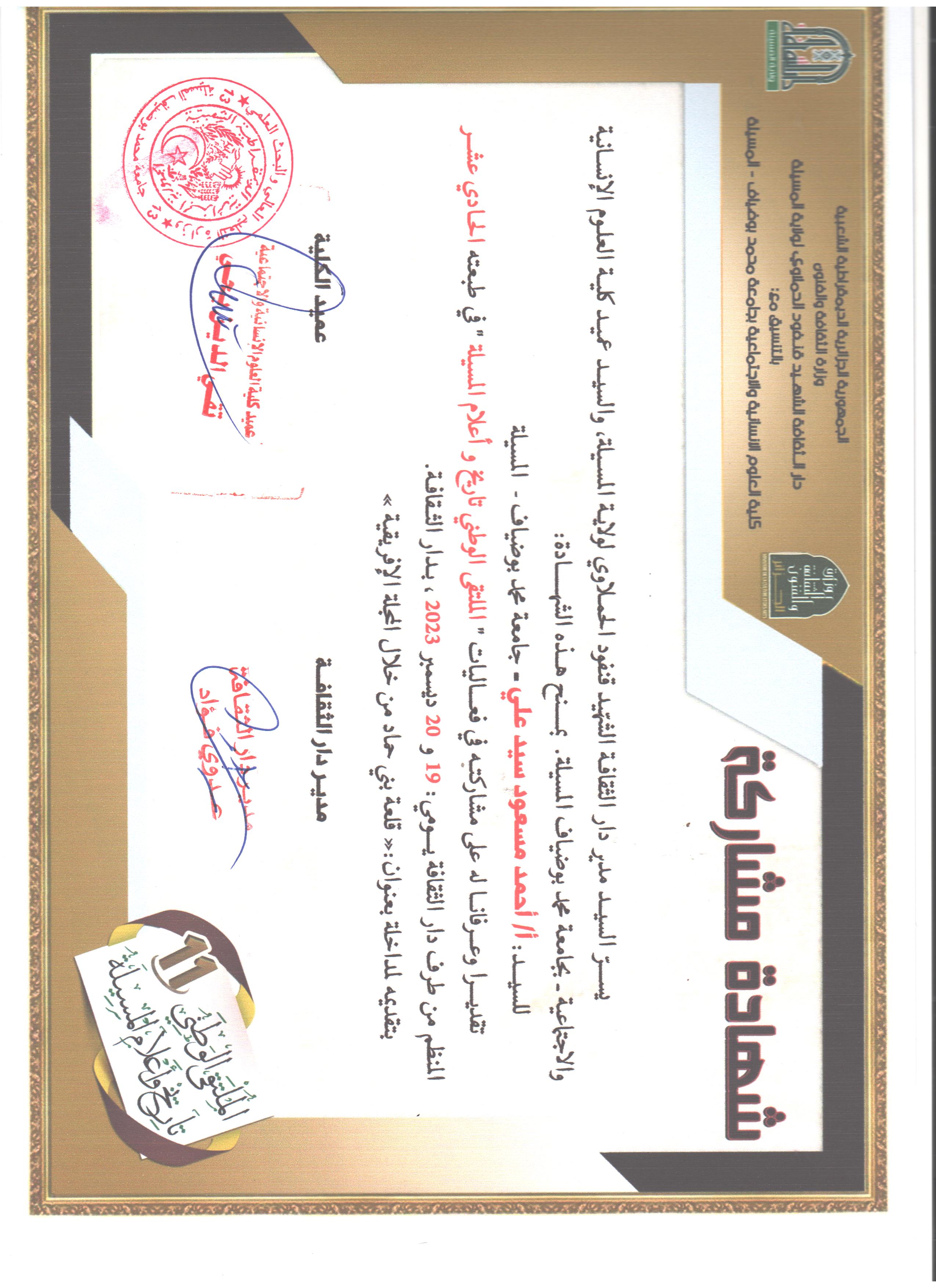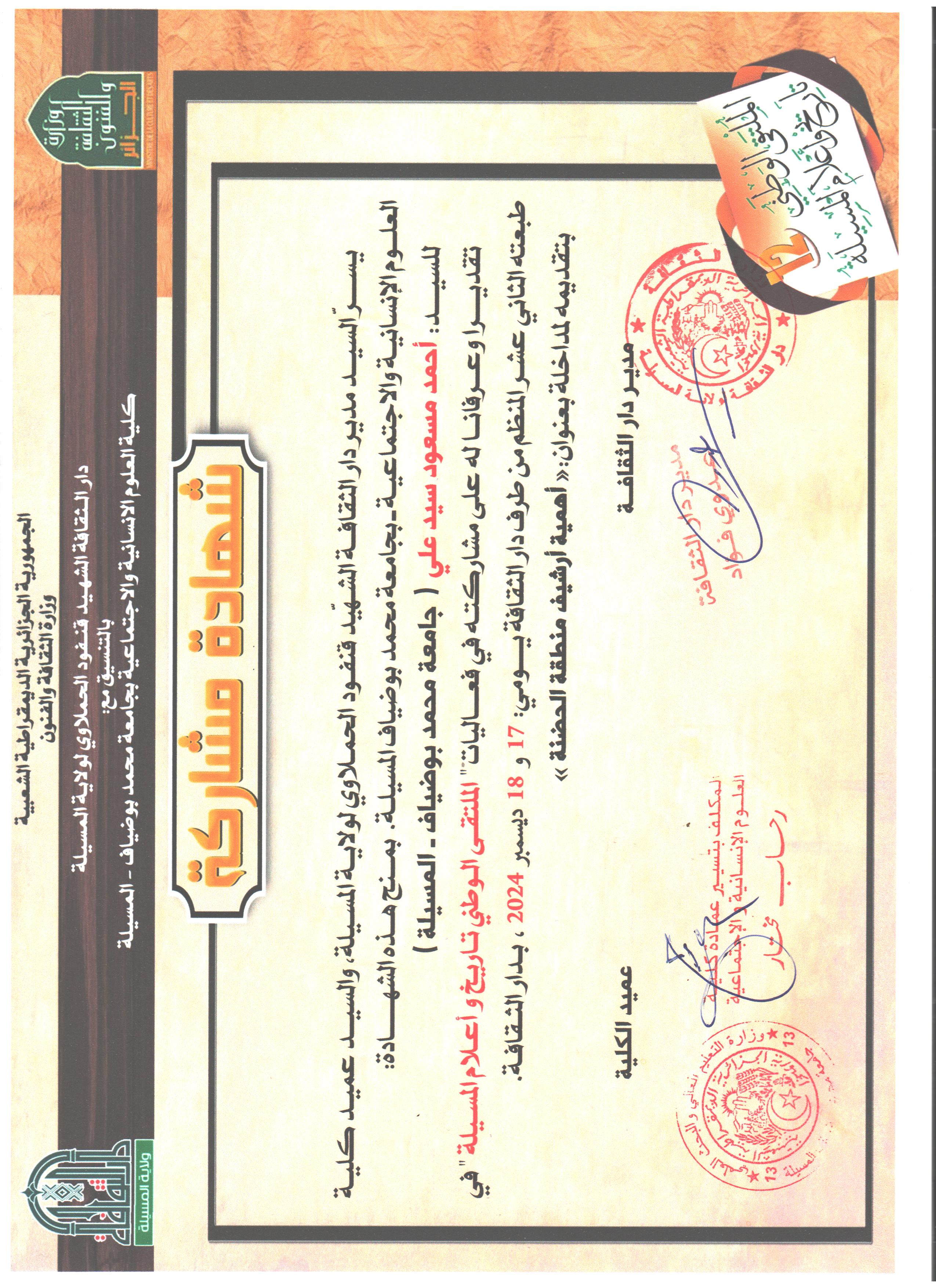 M. SIDALI Ahmedmessoud, (2024-12-18), "اهمية ارشيف منطقة الحضنة", [national] ملتقى وطني حول تاريخ واعلام المسيلة , ولاية المسيلة دار الثقافة بالتنسيق مع كلية العلوم الانسانية والاجتماعية