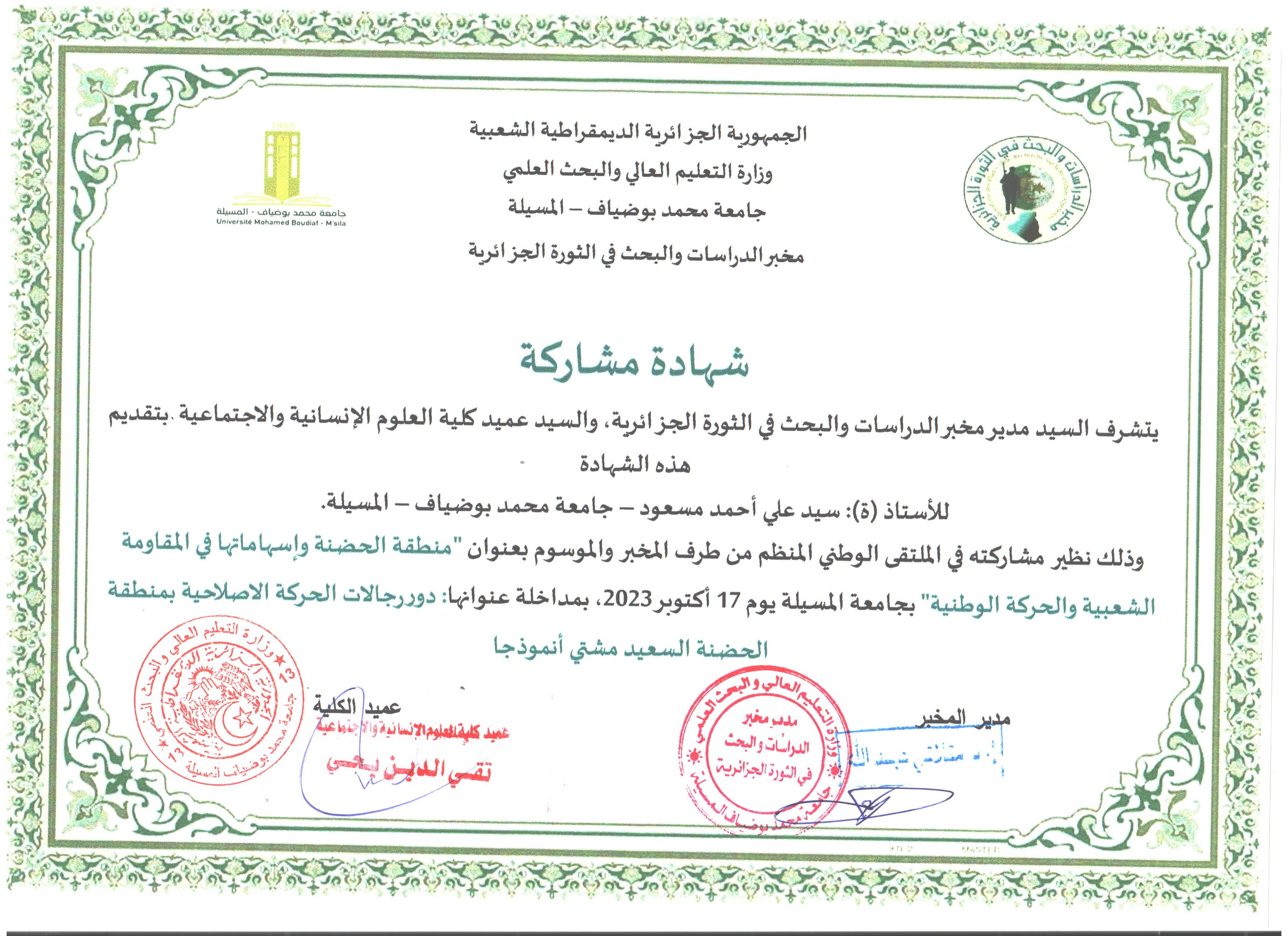 M. SIDALI Ahmedmessoud, (2023-10-11), "دور رجالات الاصلاح بمنطقة الحضنة السعيد مشتي نموذجا", [national] منطقة الحضنة واسهاماتها في الحركة الوطنية والثورة التحريرية , جامعة المسيلة