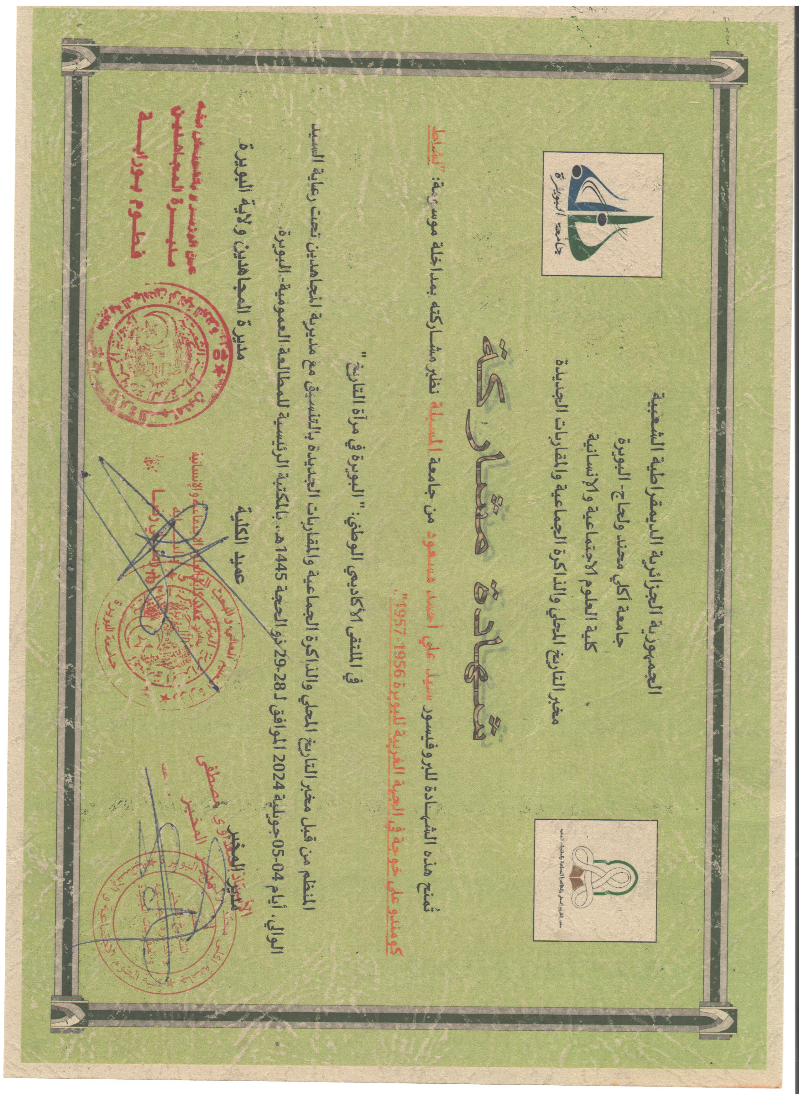 M. SIDALI Ahmedmessoud, (2024-07-05), "نشاط كومندو علي خوجة في الجهة الغربية للبويرة 1956/1957", [national] البويرة في مآة التاريخ , جامعة البويرة