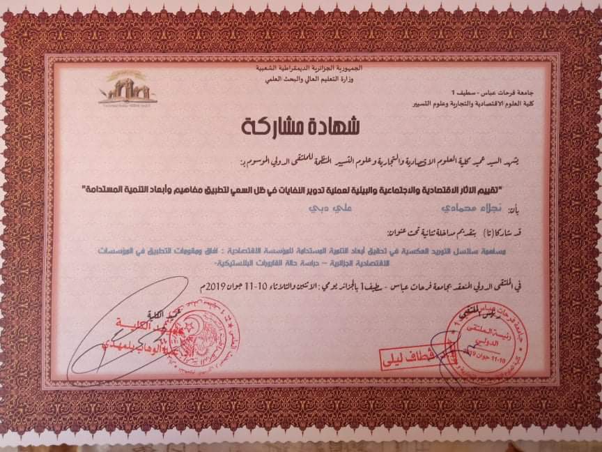 M. DEBBI Ali, محمادي نجلاء, , (2019), "مساهمة سلاسل التوريد العكسية في تحقيق أبعاد التنمية المستدامة للمؤسسة الاقتصادية :آفاق وتوجهات التطبيق في المؤسسات الاقتصادية الجزائرية - دراسة حالة القارورات البلاستيكية", [international] تقييم الآثار الاقتصادية والبيئية لعملية تدوير النفايات في ظل السعي لتطبيق مفاهيم وأبعاد التنمية المستدامة , جامعة سطيف