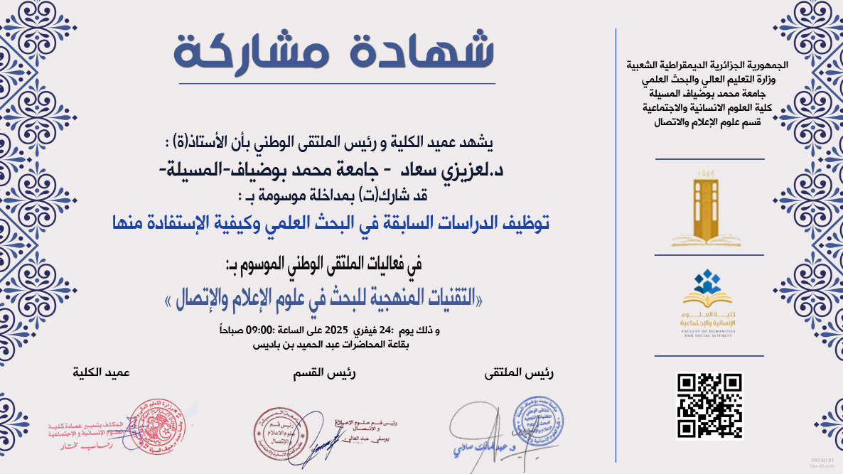 M. LAZIZI Souad, (2025-02-24), "توظيف الدراسات السابقة في البحث العلمي وكيفية الاستفادة منها", [national] التقنيات المنهجية للبحث في علوم الإعلام والاتصال , جامعة المسيلة