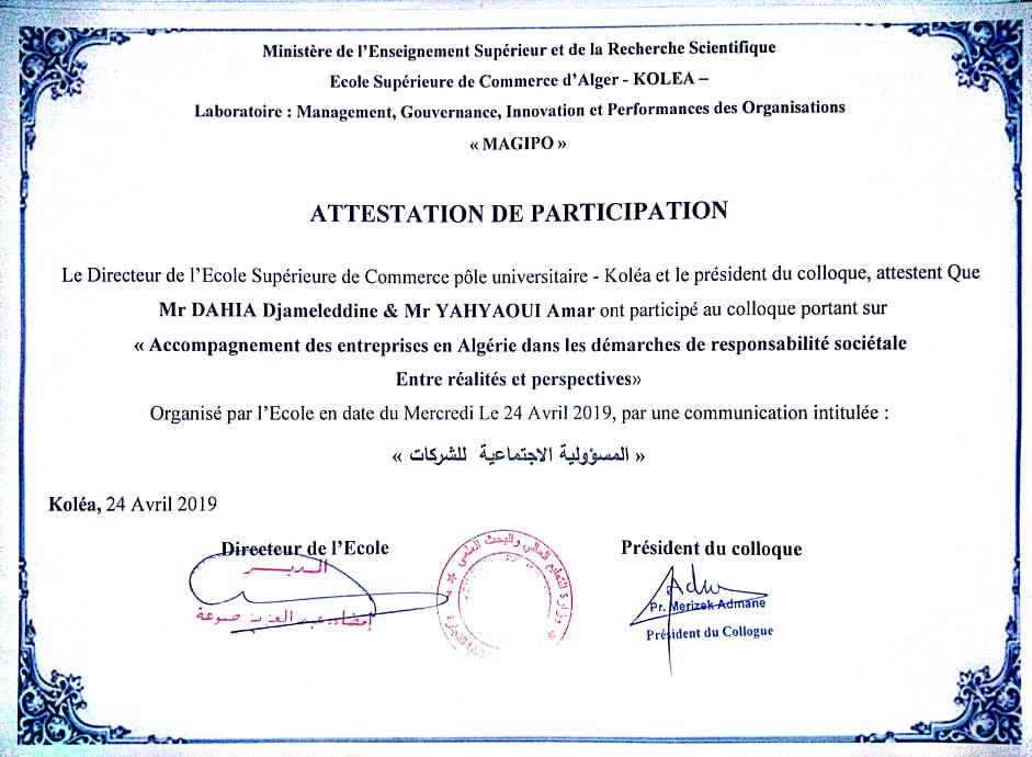 M. YAHIAOUI Amar, (2019), "المسؤولية الاجتماعية للشركات", [national] Accompagnement des entreprisees en Algerie dans les démarches de responsabilité sociétale entre réalités et perspectives , المدرسة العليا للتجارة القليعة