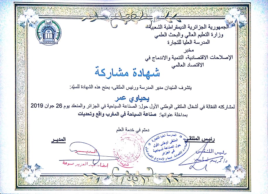 M. YAHIAOUI Amar, (2019), "آفاق تطوير السياحة بالجزائر في ظل التحديات الراهنة", [national] الاصلاحات الاقتصادية والاندماج في الاقتصاد العالمي المدرسة العليا للتجارة القليعة , المدرسة العليا للتجارة