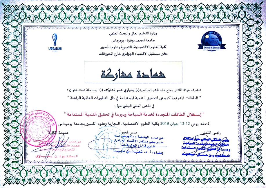 M. YAHIAOUI Amar, (2019), "الطاقات المتجددة كمسعى لتحقيق التنمية المستدامة في ظل التطورات العالمية الراهنة", [national] استغلال الطاقات المتجددة لخدمة السياحة ودورها في تحقيق التنمية المستدامة , جامعة امحمد بوقرة بومرداس
