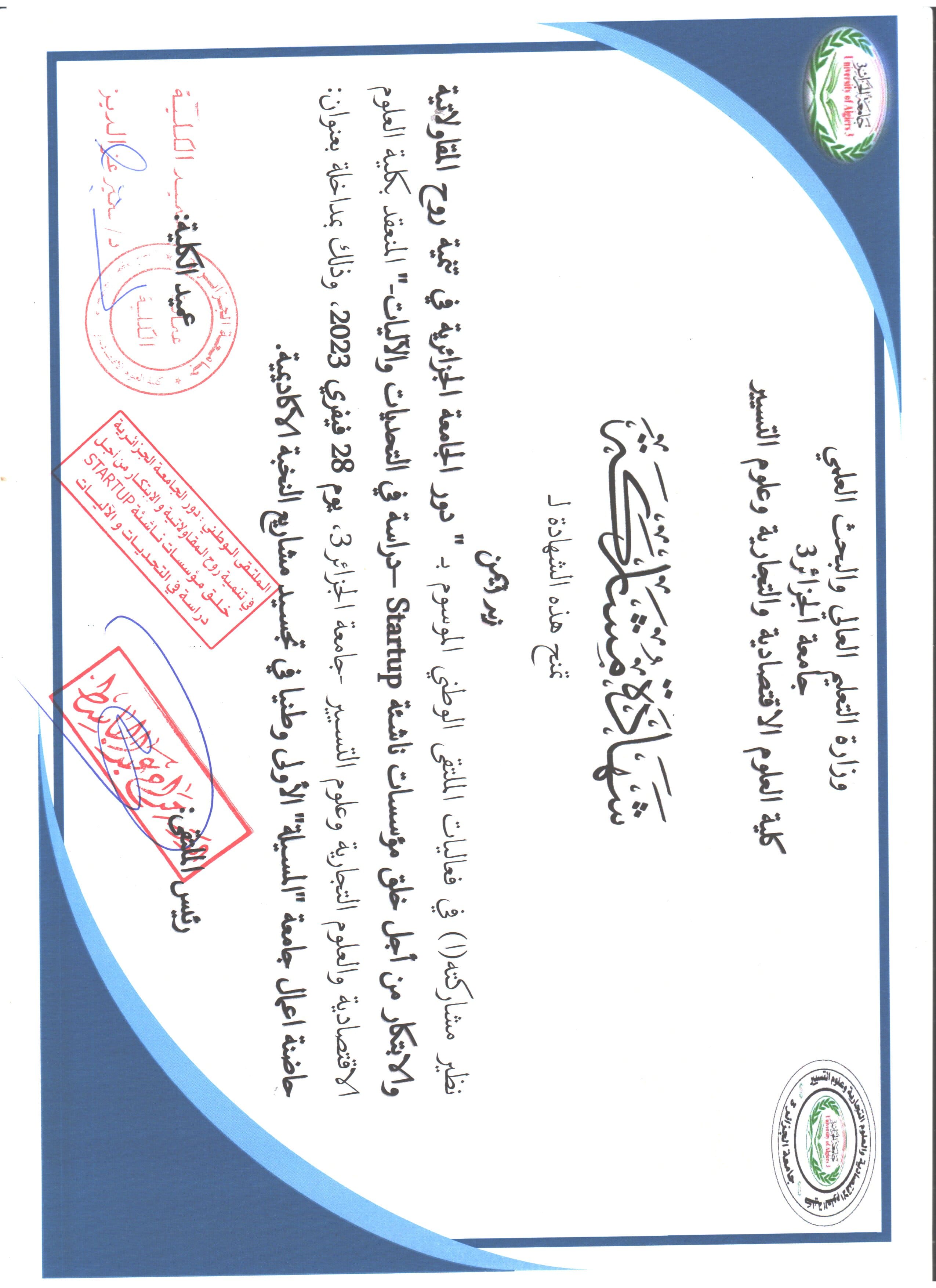 M. ZEID Aymen, (2023), "حاضنة اعمال جامعة المسيلة الاولى وطنيا في تجسيد مشاريع النخبة الاكاديمية", [national] دراسة في التحديات والاليات startup- دور الجامعة الجزائرية في تنمية روح المقاولاتية والابتكار من اجل خلق مؤسسات ناشئة , جامعة الجزائر3