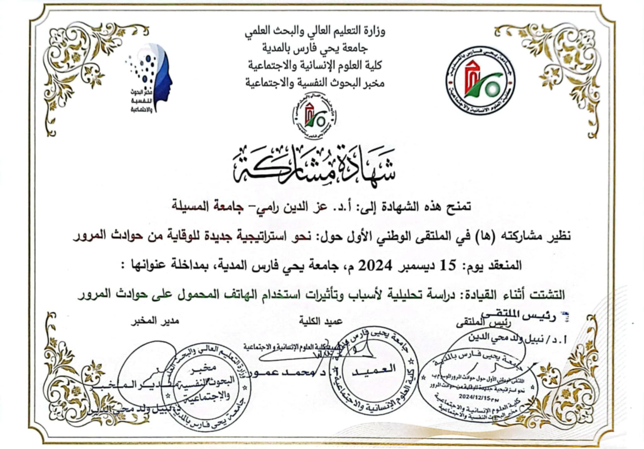 M. RAMI Azeddine, (2024-12-25), "دراسة تحليلية لأسباب وتأثيرات إستخدام الهاتف المحمول على حوادث المرور", [national] نحو إستراتيجية جديدة للوقاية من حوادث المرور , جامعة المدية