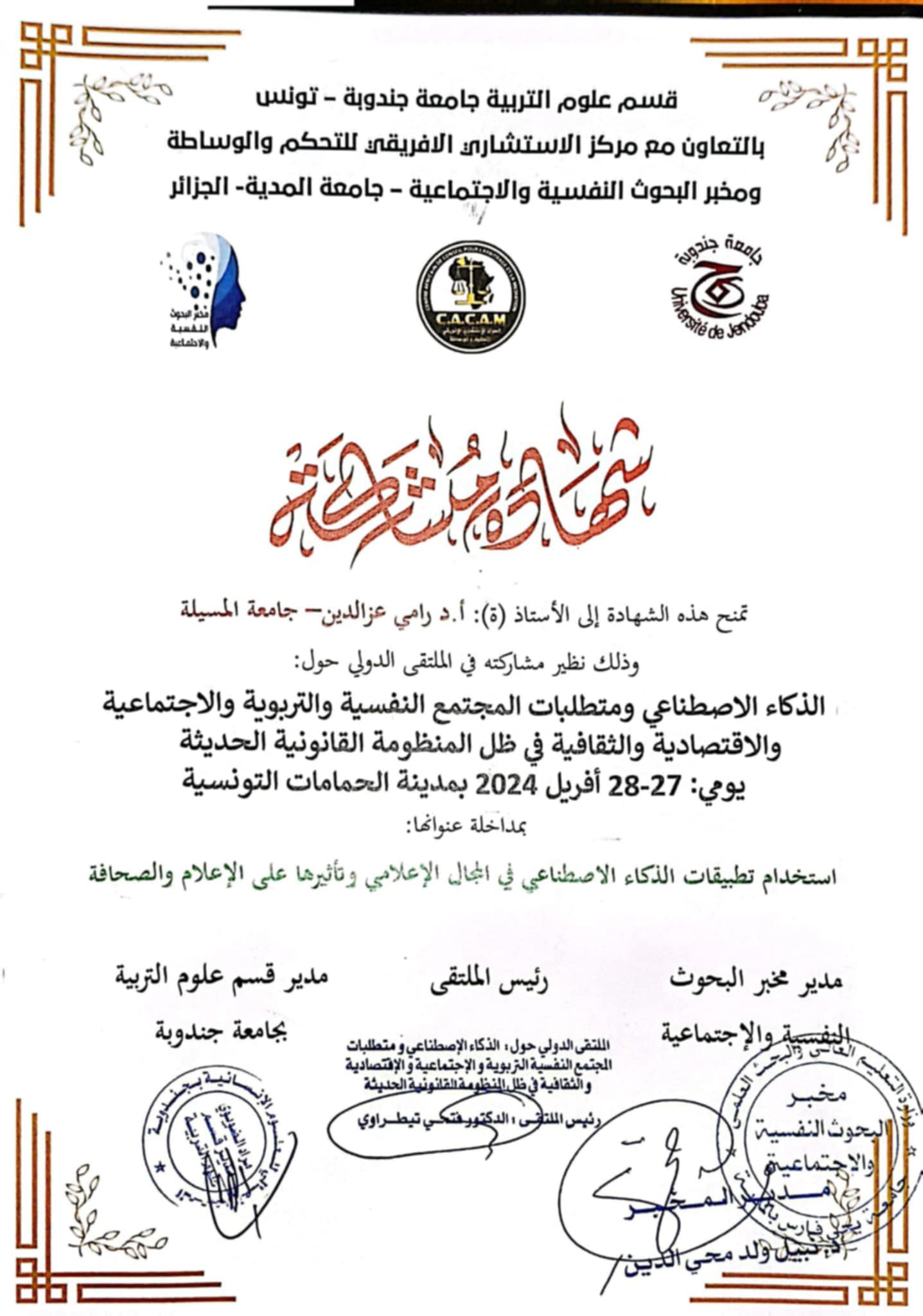 M. RAMI Azeddine, (2024-04-27), "استخدام تطبيقات الذكاء الاصطناعي في المجال الإعلامي وتأثيرها على الإعلام والصحافة", [international] الذكاء الاصطناعي ومتطلبات المجتمع النفسية والتربوية والاجتماعية والاقتصادية والثقافية في ضل المنضومة القانونية الحديثة , الحمامات - تونس