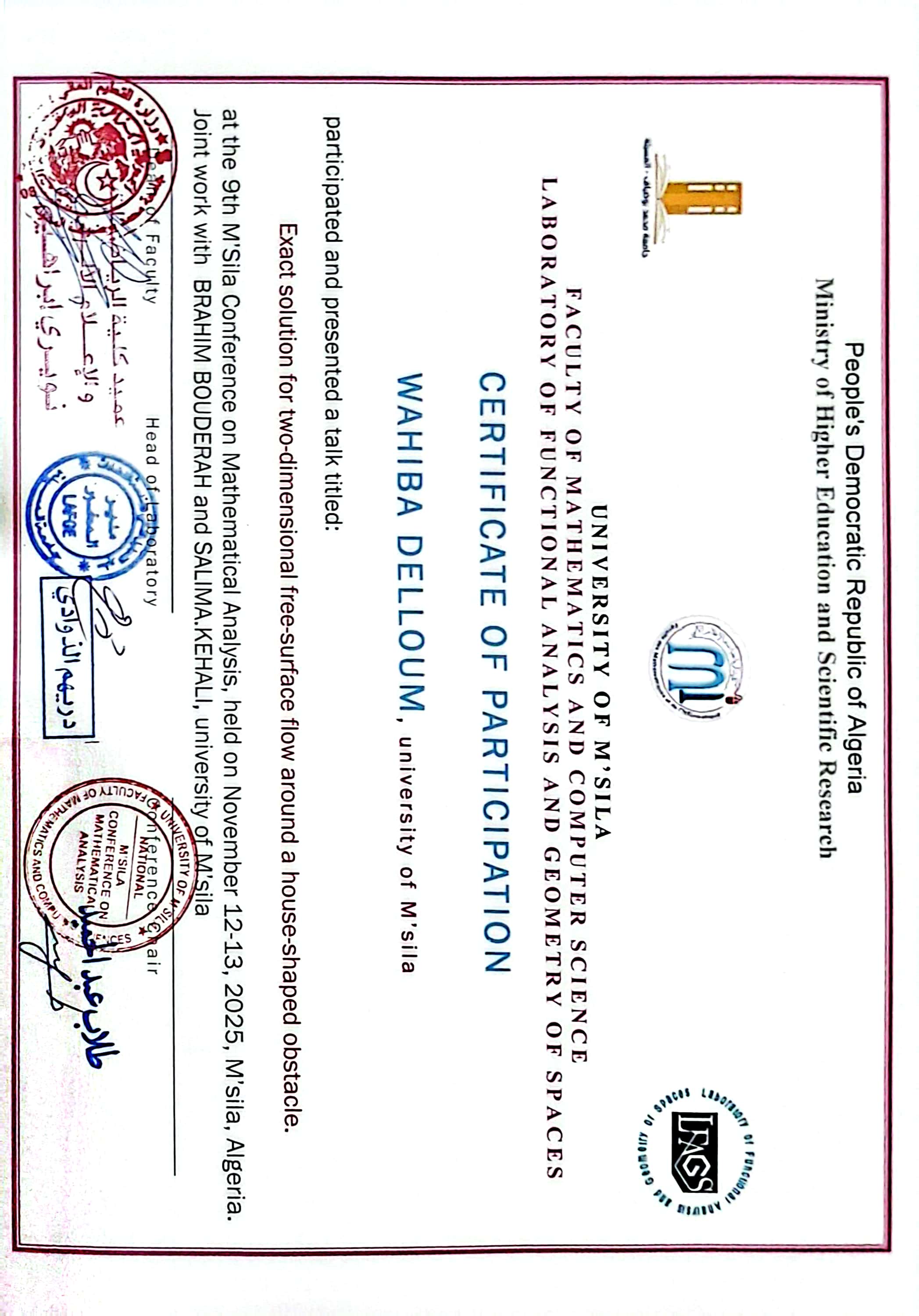 M. DELLOUM Wahiba, (2025-11-13), "EXACT SOLUTION FOR TWO-DIMENSIONAL FREE-SURFACE FLOW AROUND A HOUSE-SHAPED OBSTACLE", [national] 9 th Mísila Conference on Mathematical Analysis (MCMAí2025) In Honor of Professor LahcËne Mezrag on the occasion of his 70th Birthday. , Mísila, Algeria