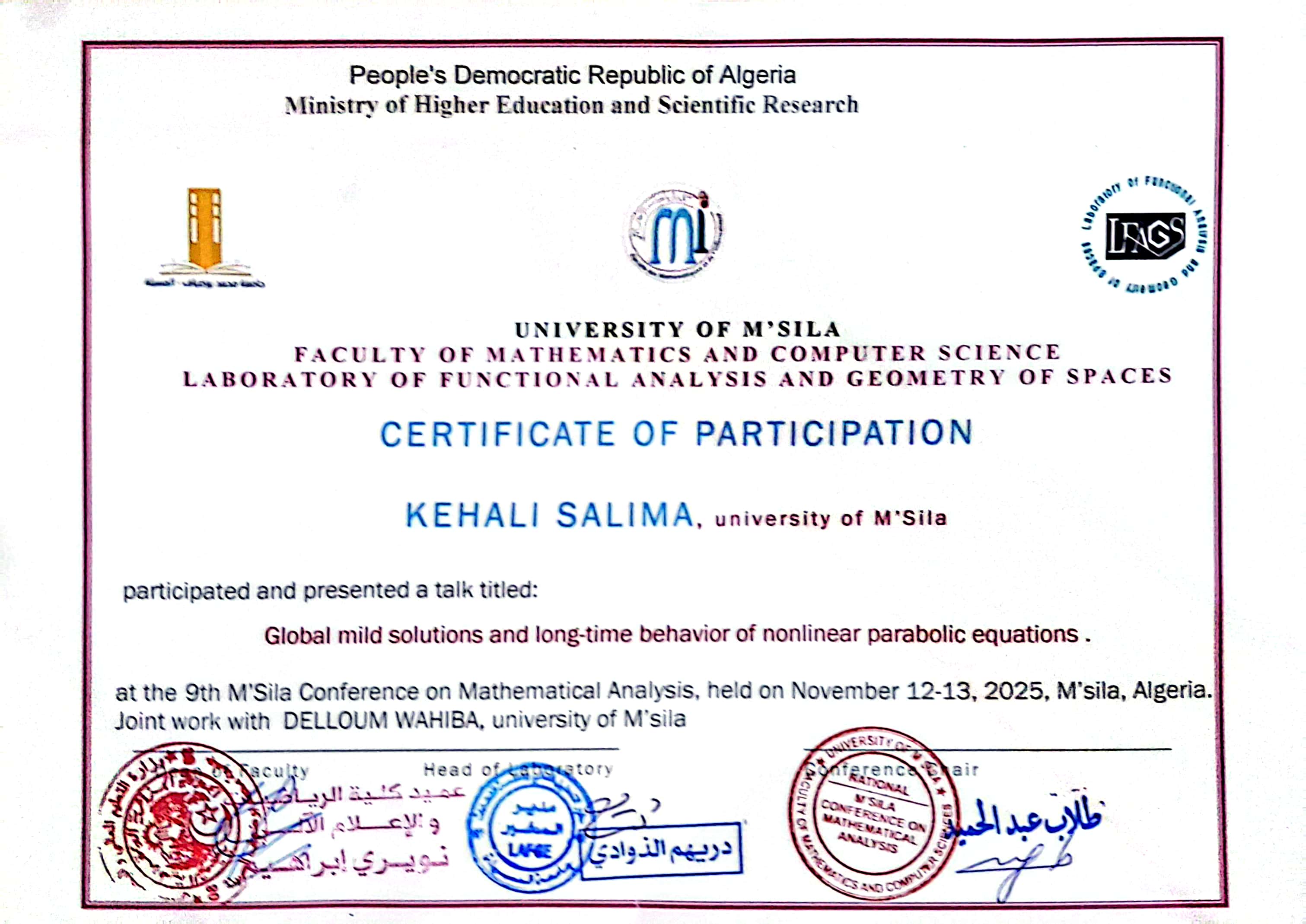 M. DELLOUM Wahiba, (2025-11-12), "Global mild solutions and long- time behavior of nonlinear parabolic equations", [national] 9th M'Sila Conference on Mathematical Analysis , University of We are delighted to extend an invitation for you to join us at 9th M'Sila Conference on Mathematical Analysis, taking place on Mathematics and Computer Science, University of M'sila. It would be a privilege to have you contribute a talk enti