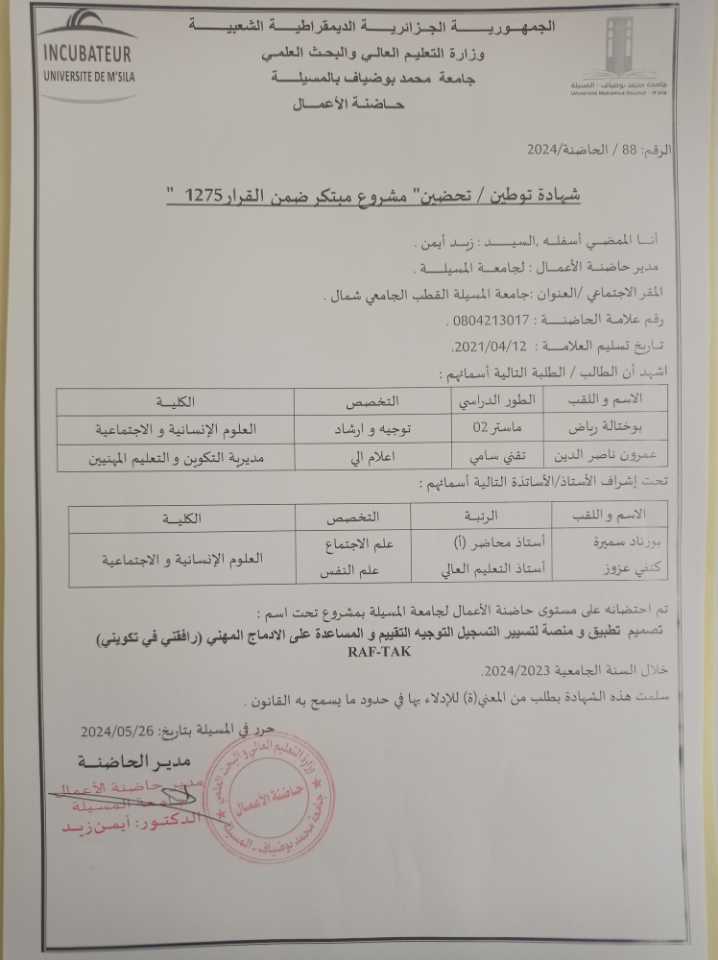 M. KETFI Azzouz, (2024-06-06), "تصميم وتطبيق منصة لتسجيل والتوجيه والتقييم والمساعدة على الادماج المهني رافقني-RAF-TAK", [national] جامعة المسيلة