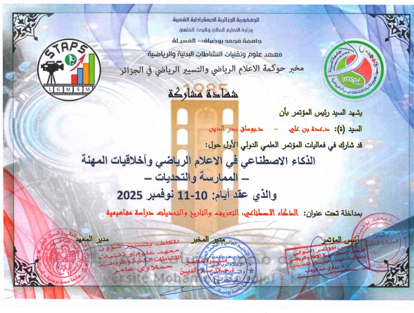 M. BOUSSAG Badreddine, (2020), "اعداد وتحضير لاعبي كرة القدم فئات)5 - 18 سنة)", [international] الدورة التكوينية , جامعة محمد بوضياف المسيلة