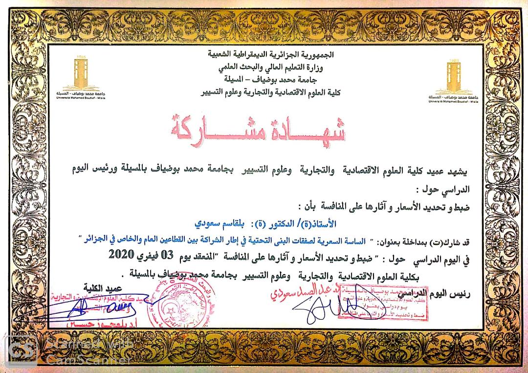 M. SAOUDI Belkacem, (2020), "السياسة السعرية لصفقات البنى التحتية في إطار الشراكة بين القطاعين العام والخاص في الجزائر", [national] ضبط وتحديد الأسعار وأثارها على المنافسة , جامعة المسيلة