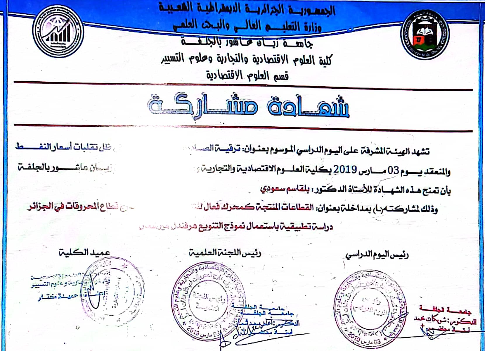 M. SAOUDI Belkacem, (2019), "القطاعات المنتجة كمحرك فعال للتنويع الاقتصادي خارج قطاع المحروقات", [national] ترقية الصادرات خارج المحروقات في ظل تقلبات أسعار النفط , جامعة الجلفة