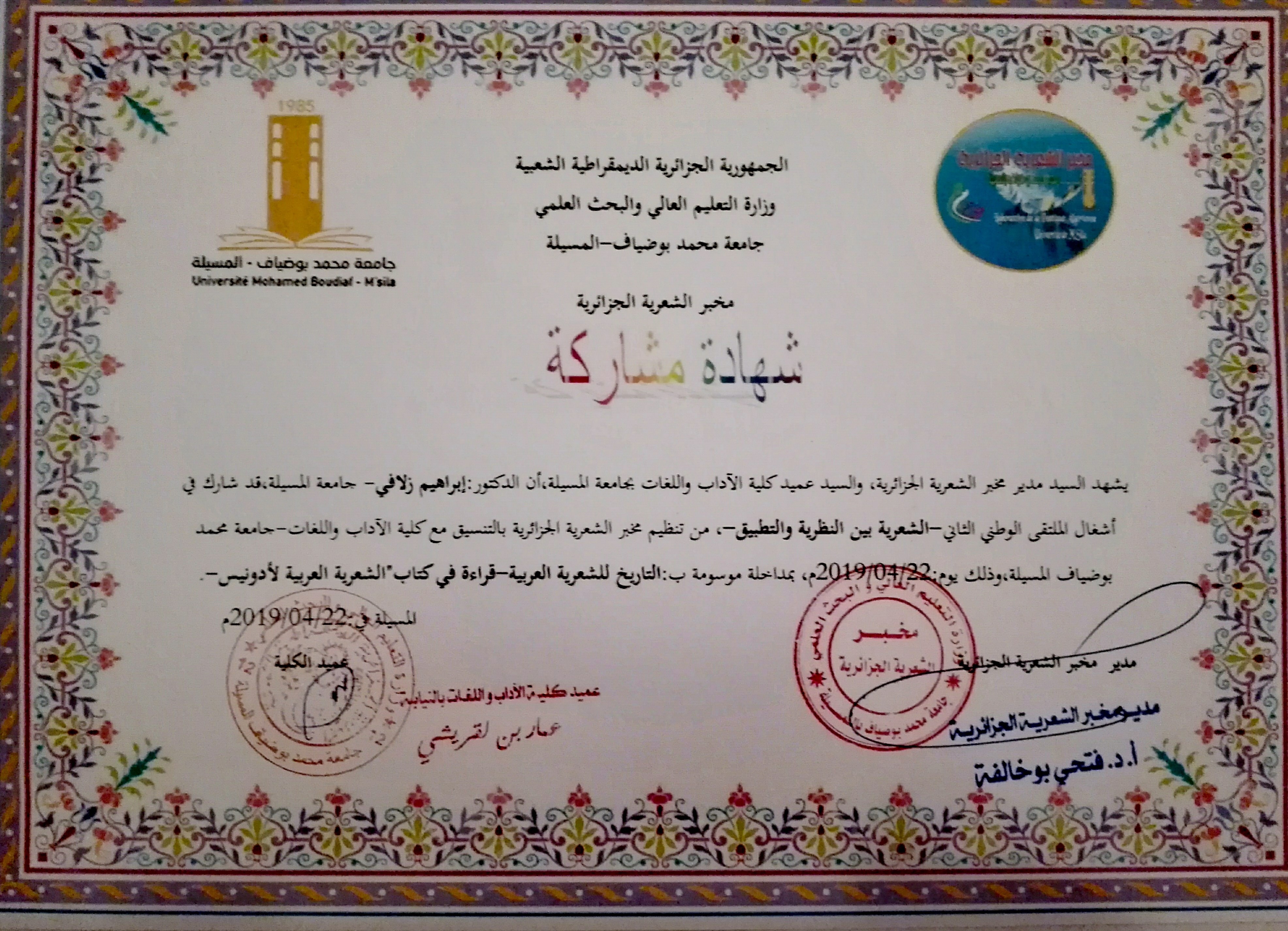 M. ZELAFI Brahim, (2023-06-20), "الشعر الشعبي شاهد على مقاومة الشعب الجزائري للاحتلال -شعر محمد بن الزوالي أنموذجا-", [national] مخبر الدراسات اللغوية النظرية والتطبيقية جامعة المسيلة , جامعة محمد بوضياف بالمسيلة
