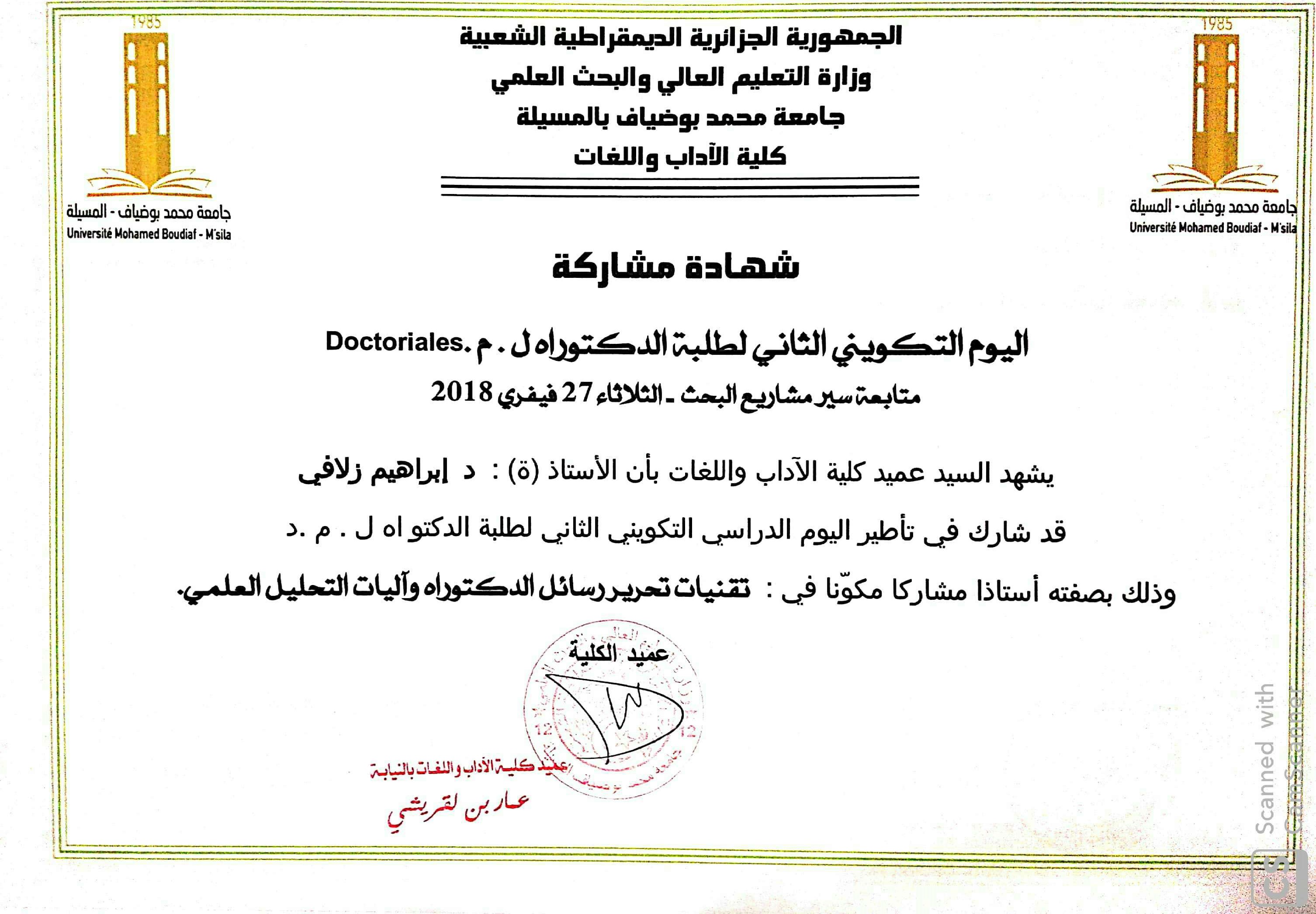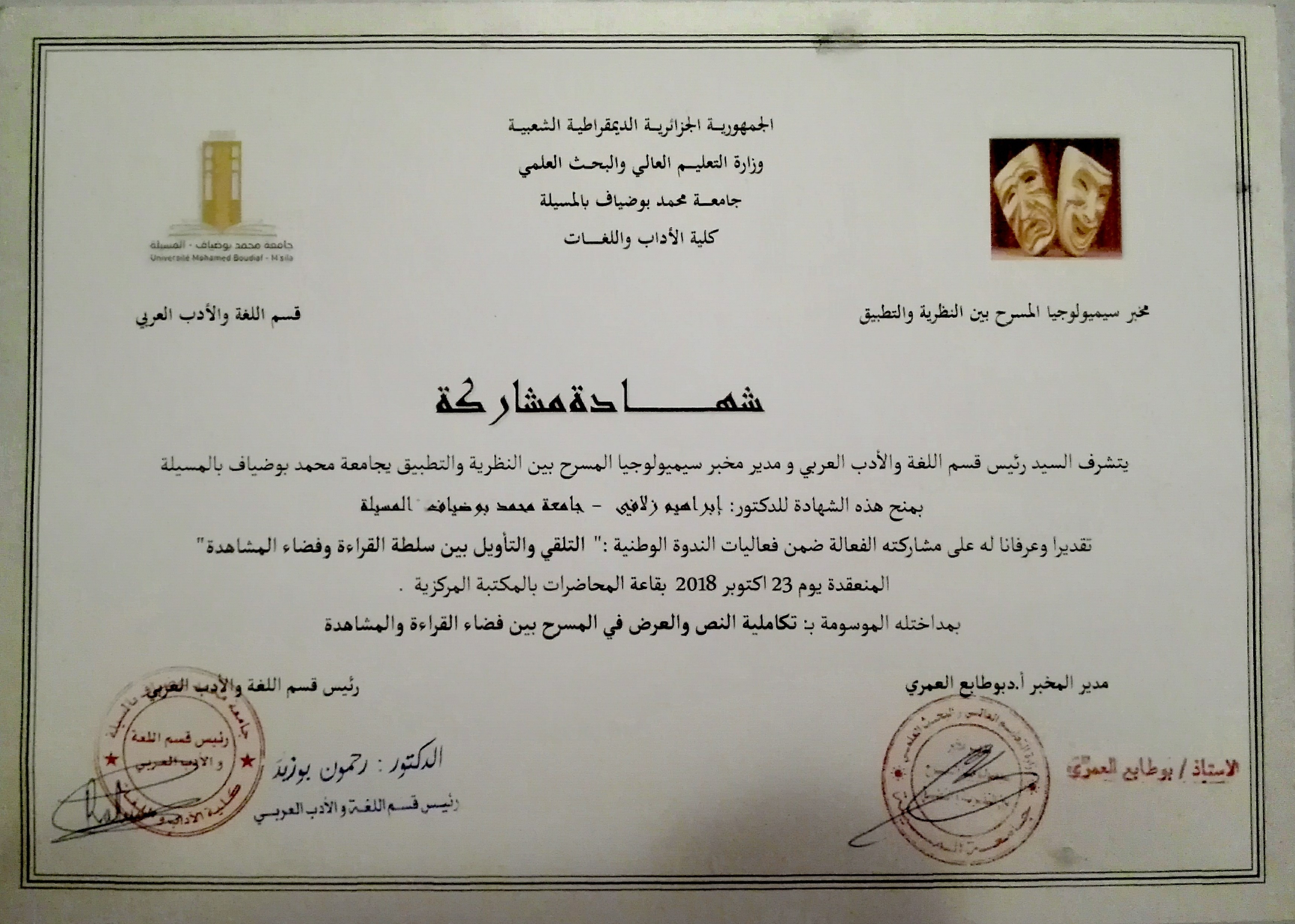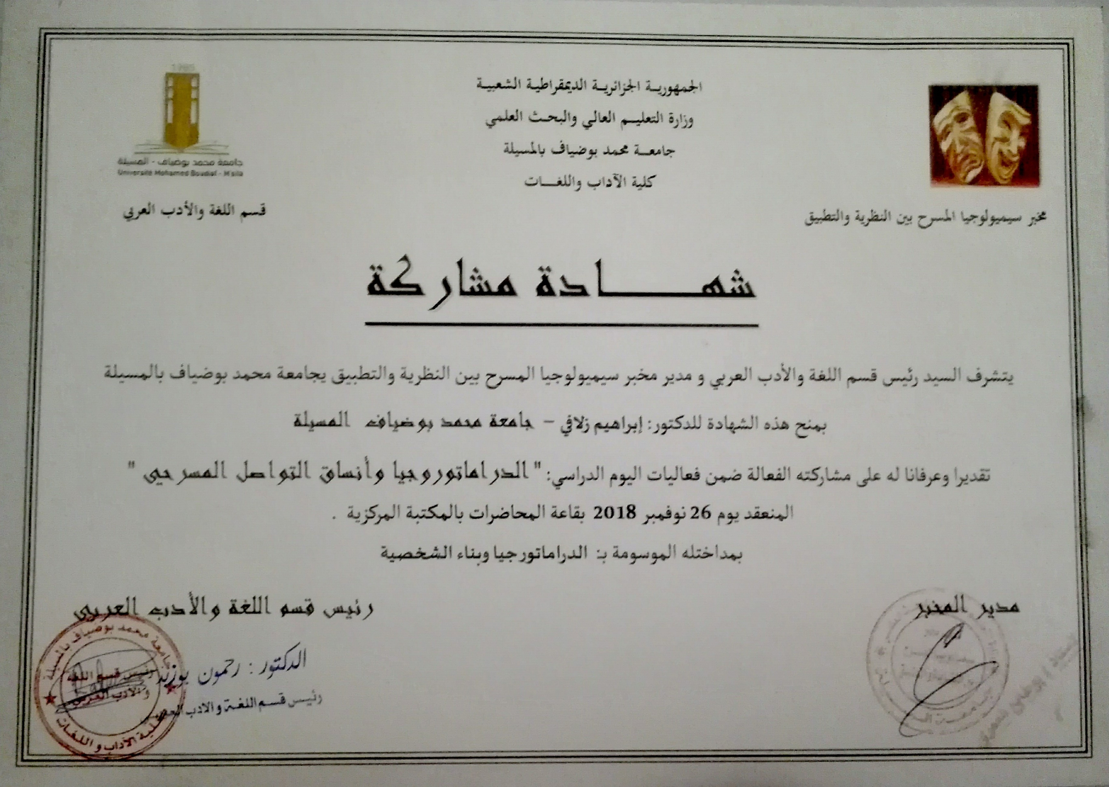 M. ZELAFI Brahim, (2018), "الدراماتورجيا وبناء الشخصية", [national] اليوم الدراسي: الدراماتورجيا وانساق التواصل المسرحي , جامعة المسيلة