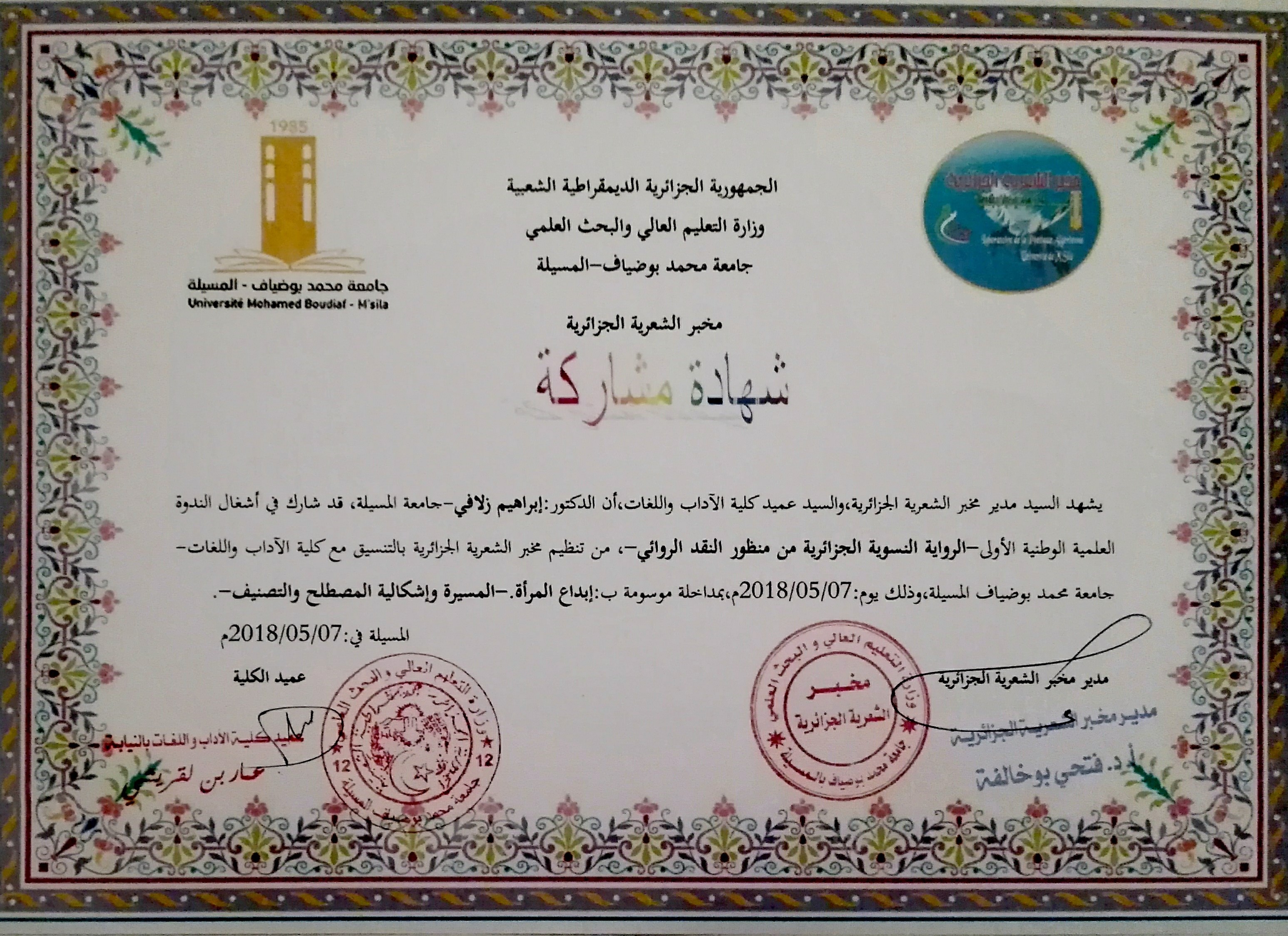 M. ZELAFI Brahim, (2018), "إبداع المرأة –المسيرة وإشكالية المصطلح والتصنيف-", [national] الندوة العلمية الوطنية الأولى: "الرواية النسوية الجزائرية من منظور النقد الروائي" , جامعة المسيلة