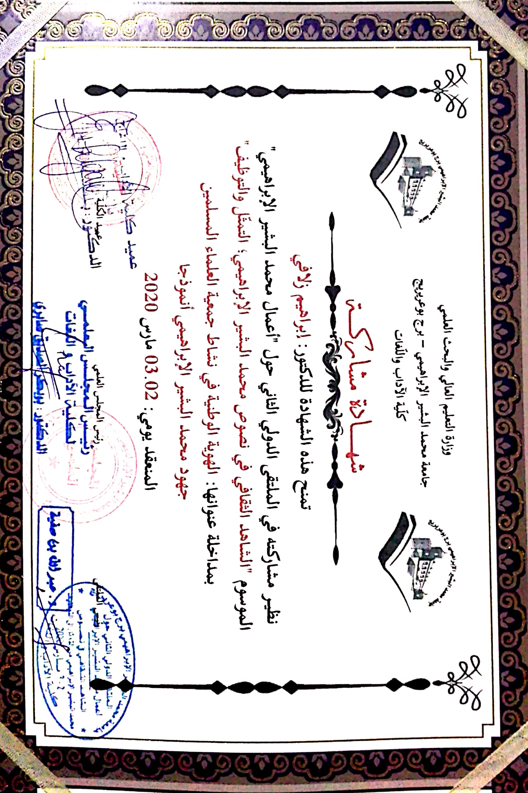 M. ZELAFI Brahim, (2020), "الهوية الوطنية في نشاط جمعية العلماء المسلمين -جهود محمد البشير الابراهيمي أنموذجا-", [international] الملتقى الدولي الثاني : الشاهد الثقافي في نصوص محمد البشير الابراهيمي ،التمثل والتوظيف , جامعة محمد البشير الابراهيمي برج بوعريريج