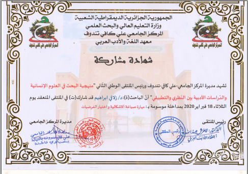 M. ZELAFI Brahim, (2018), "تكاملية النص والعرض في المسرح بين فضاء القراءة والمشاهدة", [national] الندوة الوطنية: "التلقي والتأويل بين سلطة القراءة وفضاء المشاهدة" , جامعة المسيلة
