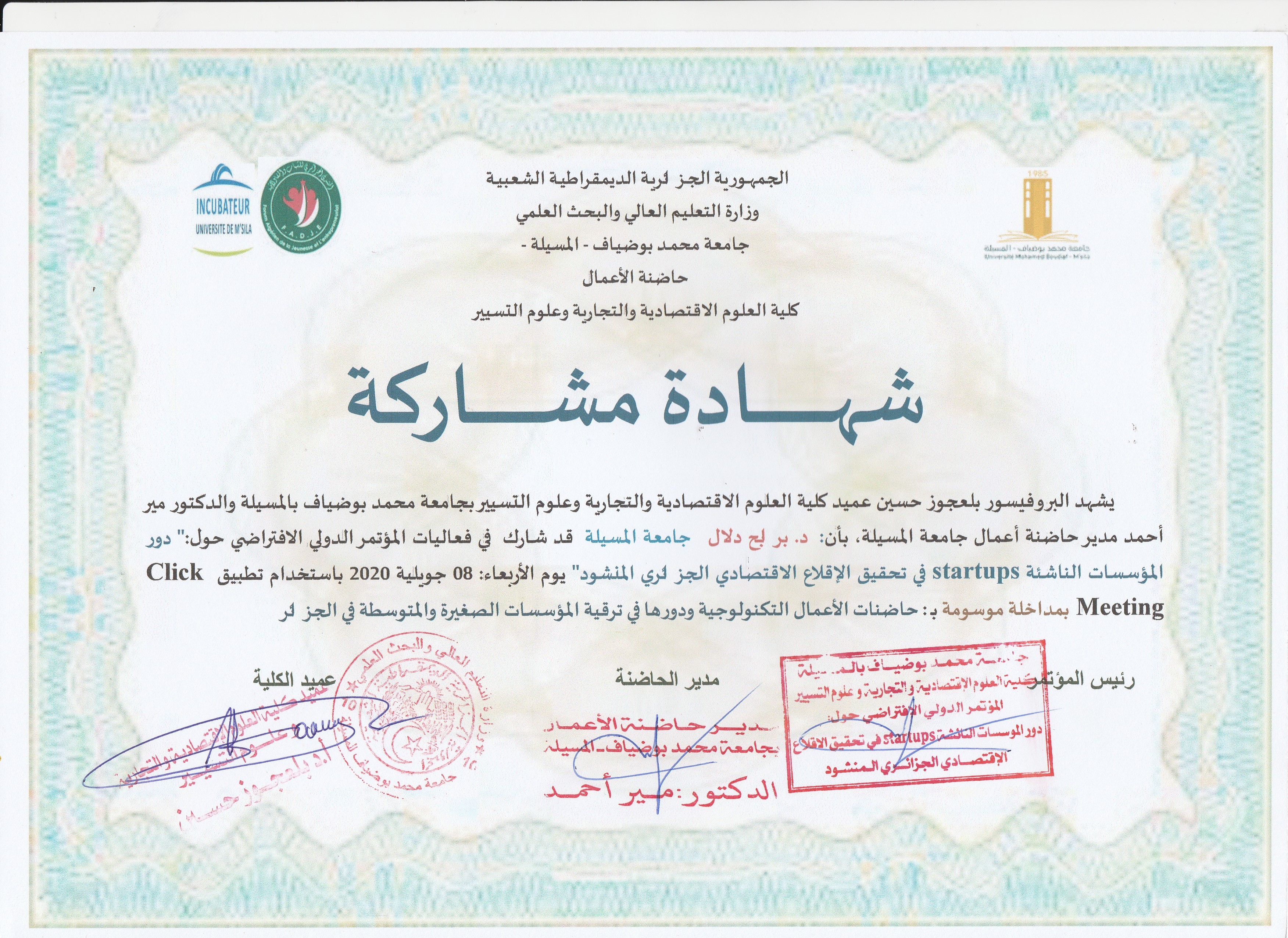 M. BERRABEH Dalal, (2020), "حاضنات الأعمال التكنولوجية ودورها في ترقية المؤسسات الصغيرة والمتوسطة في الجزائر", [national] دور المؤسسات الناشئة في تحقيق الاقلاع الاقتصادي الجزائري المنشود , جامعة المسيلة