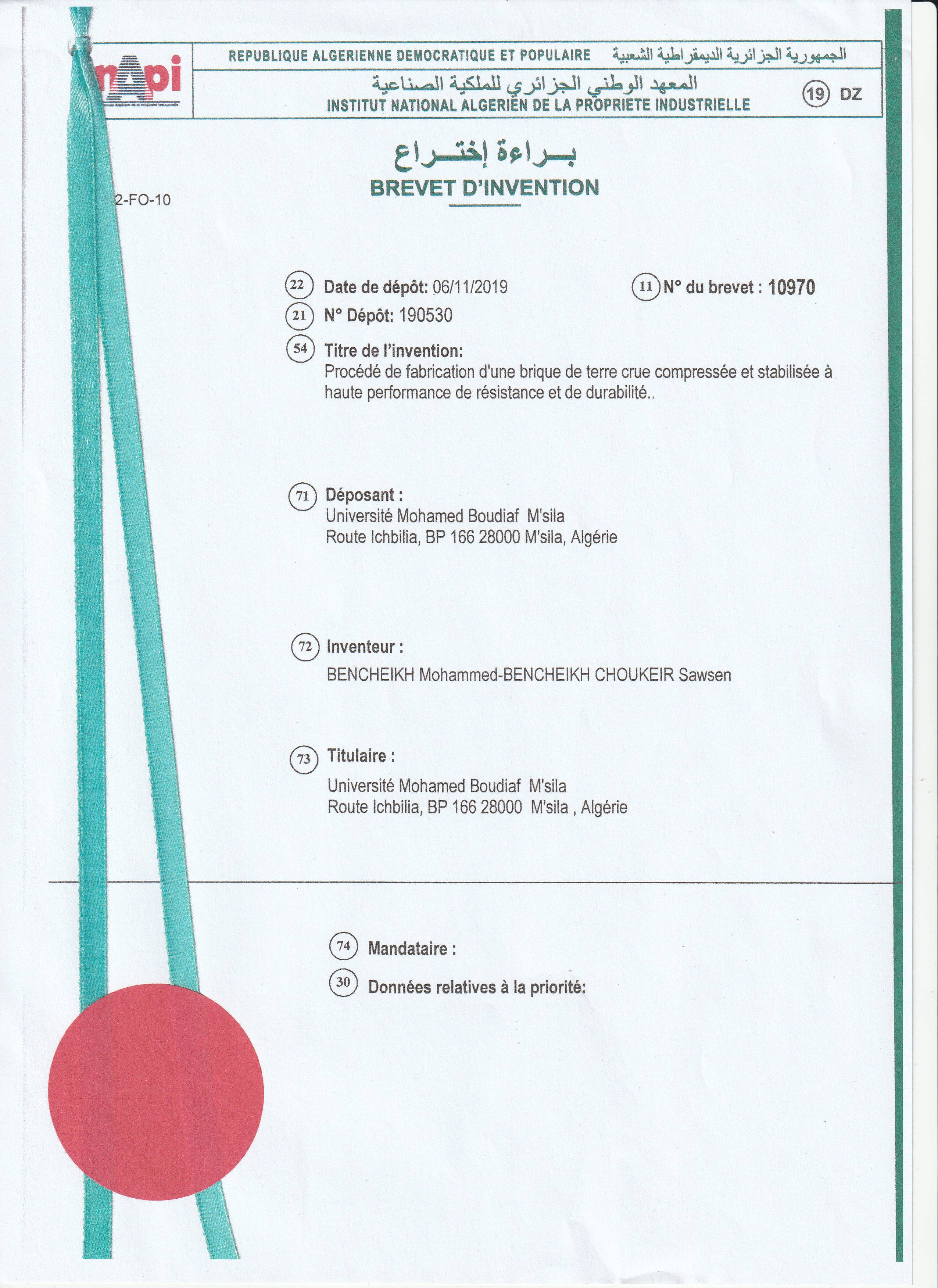 M. BENCHEIKH Mohammed, (2020), "Procédé de fabrication d'une brique de terre crue compressée et stabilisée à haute performances de resistance et durabilité BTC-HP", [international] Université Mohamed Boudiaf de M'sila , INAPI Algérie