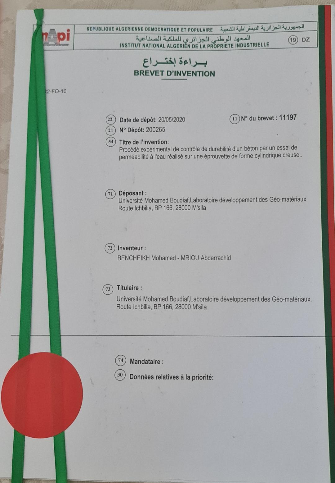 M. BENCHEIKH Mohammed, Bencheikh Mohamed, , (2021), "Procédé expérimental de contrôle de durabilité du béton réalisé par un essai de perméabilité à l'eau sur une éprouvette de forme cylindrique creuse.", [national] Université Mohamed Boudiaf de M'sila