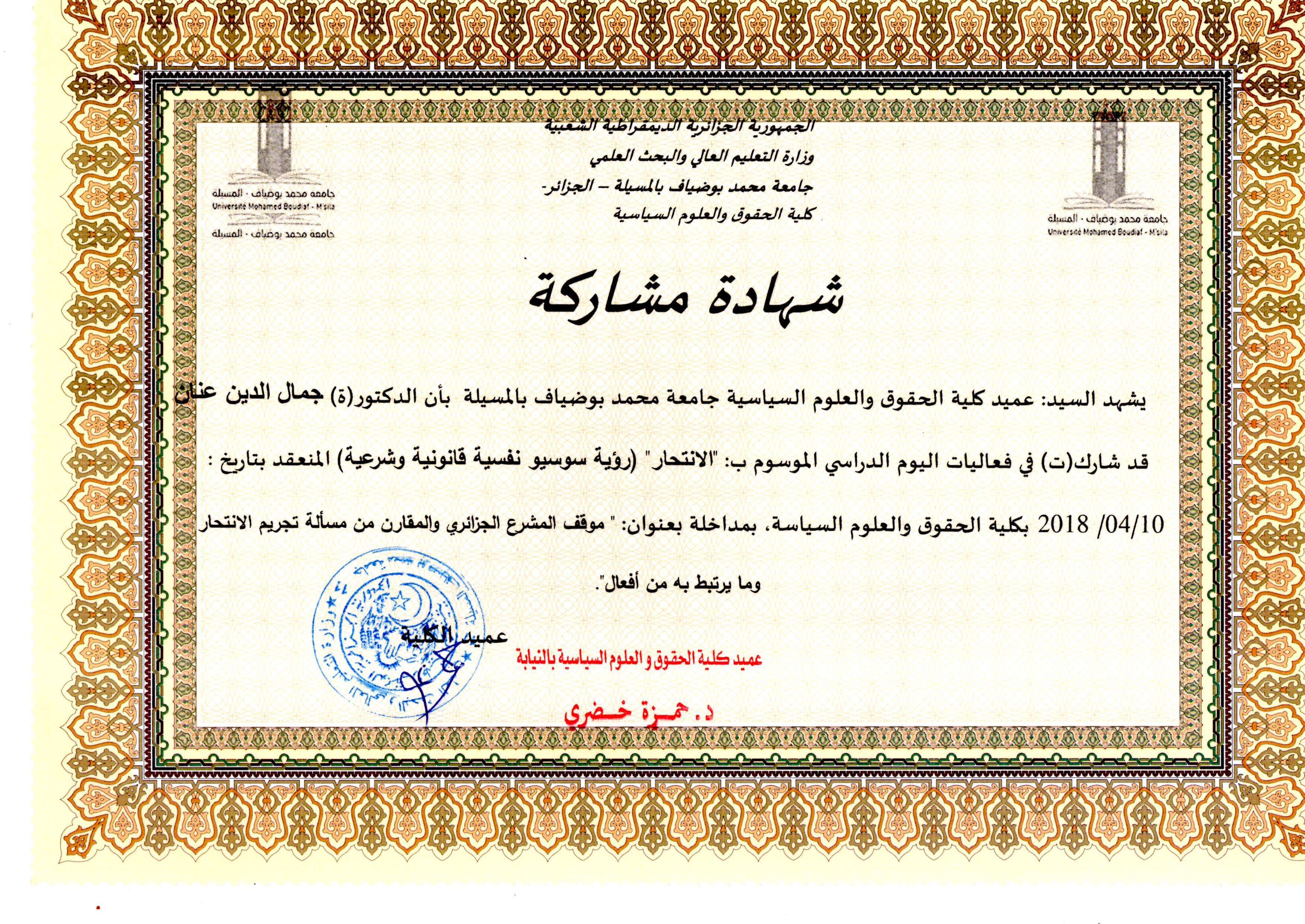 M. DJAMELEDDINE Anane, (2018), "موقف المشرع الجزائري والمقارن من مسألة تجريم الانتحار وما يرتبط به من أفعال", [national] جمال الدين عنان , كلية الحقوق والعلوم السياسية جامعة المسيلة