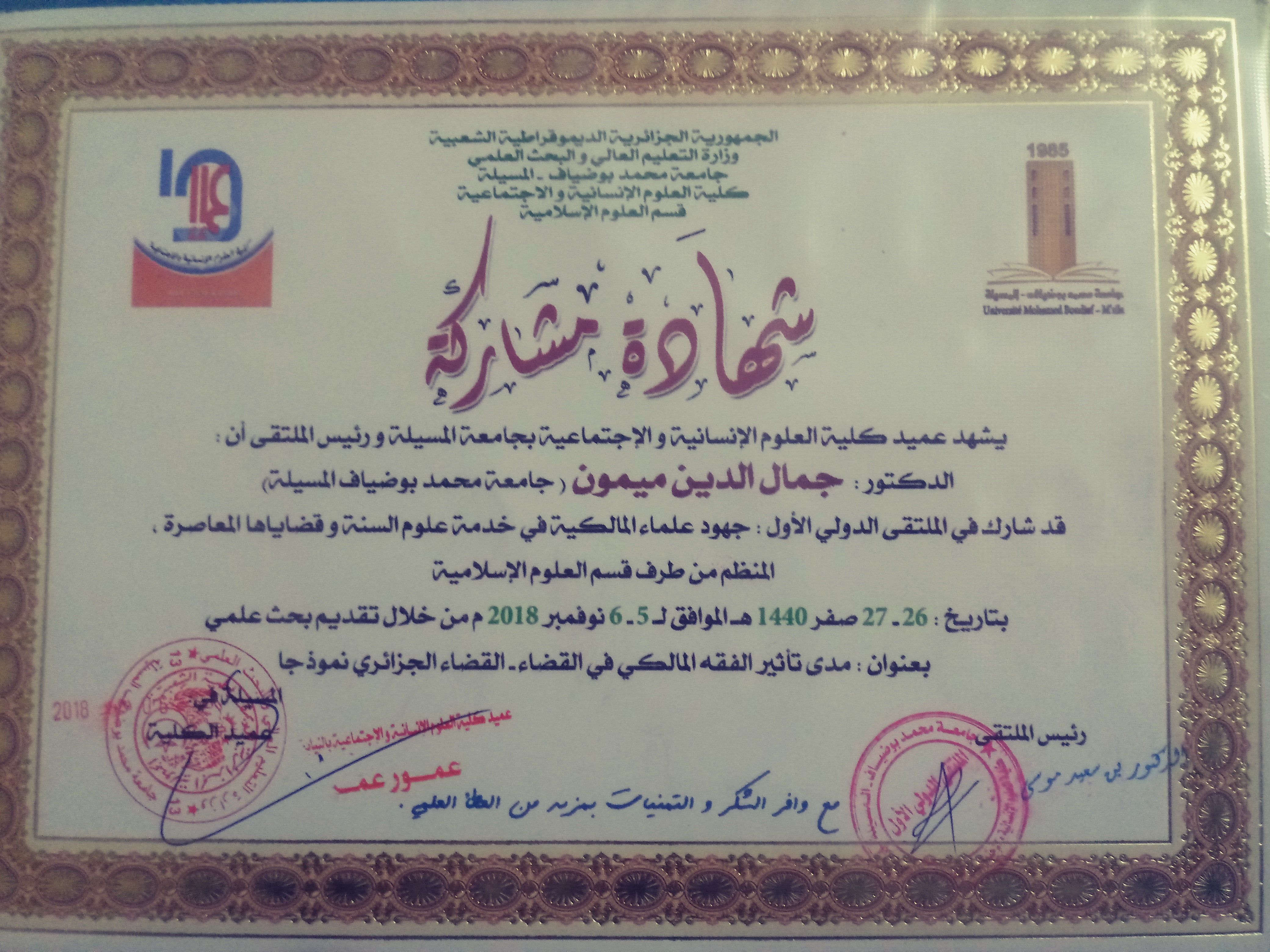 M. DJAMELEDDINE Mimoune, (2018), "مدى تأثير الفقه المالكي في القضاء-القضاء الجزائري أنموذجا", [international] جهود علماء المالكية في خدمة علوم السنة وقضاياها المعاصرة , المسيلة