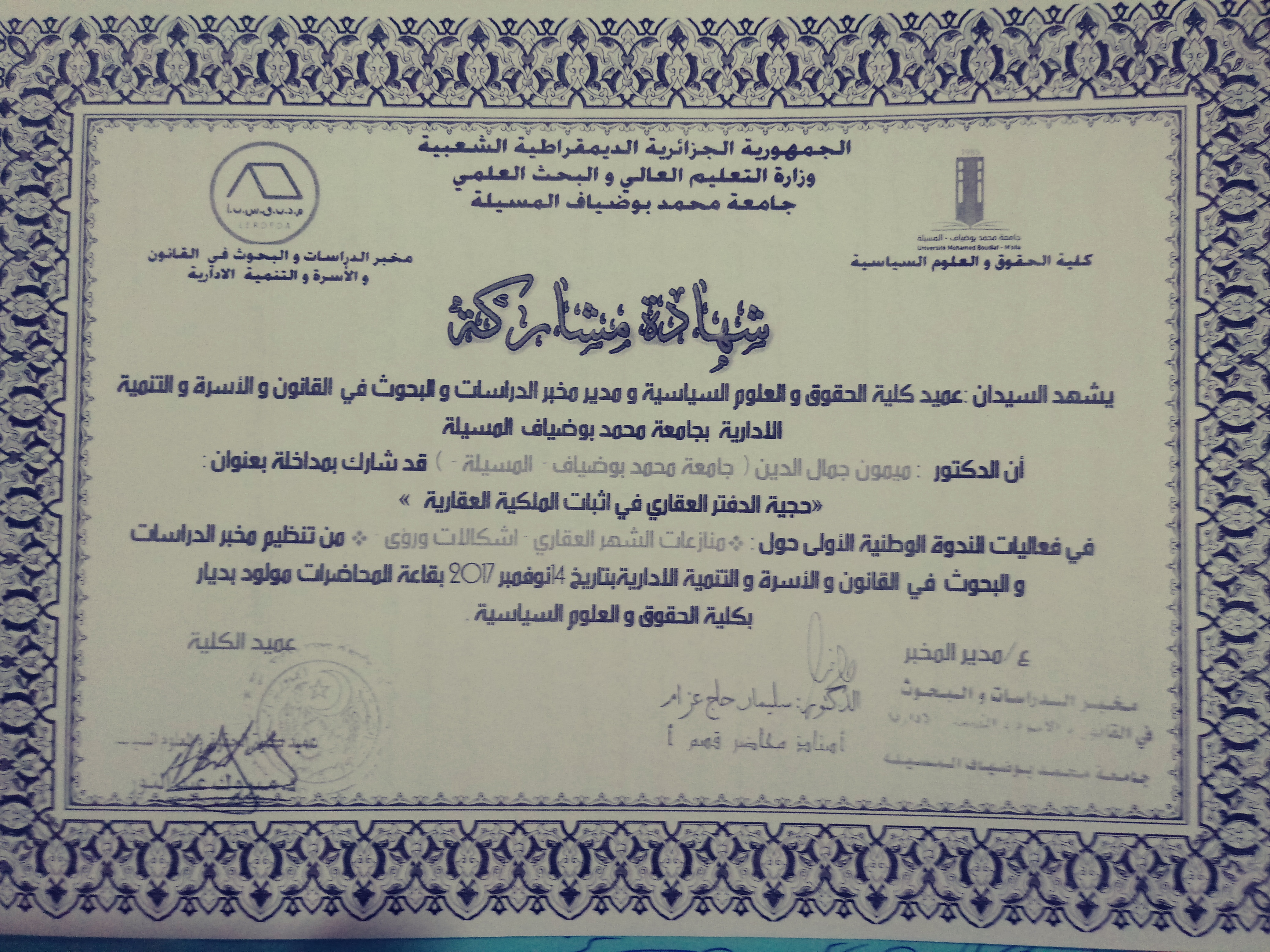 M. DJAMELEDDINE Mimoune, (2017), "حجية الدفتر العقاري في إثبات الملكية العقارية", [national] منازعات الشهر العقاري , المسيلة