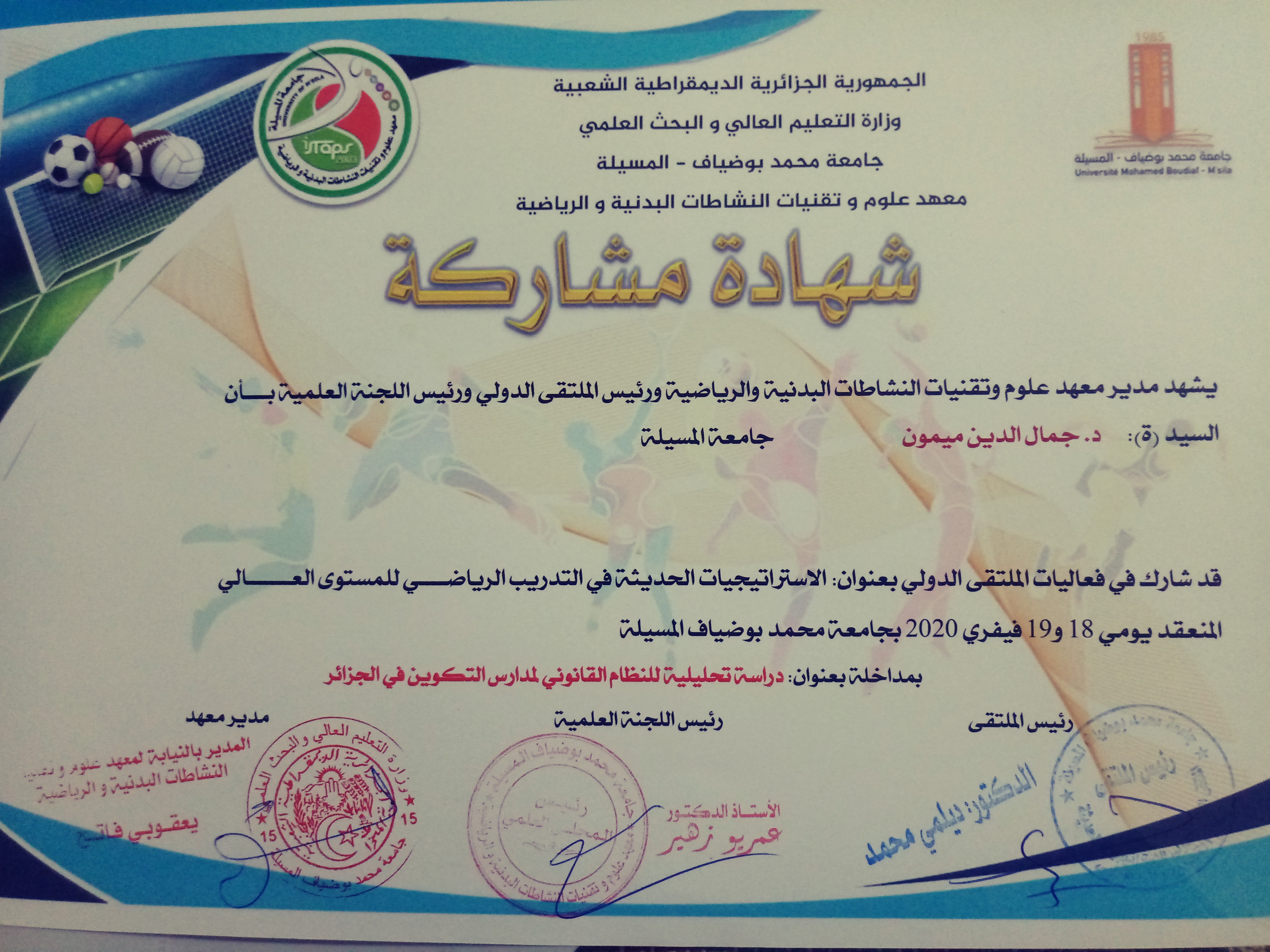 M. DJAMELEDDINE Mimoune, (2020), "دراسة تحليلية للنظام القانوني لمدارس التكوين في الجزائر", [international] الاستراتيجيات الحديثة في التدريب الرياضي للمستوى العالي , المسيلة