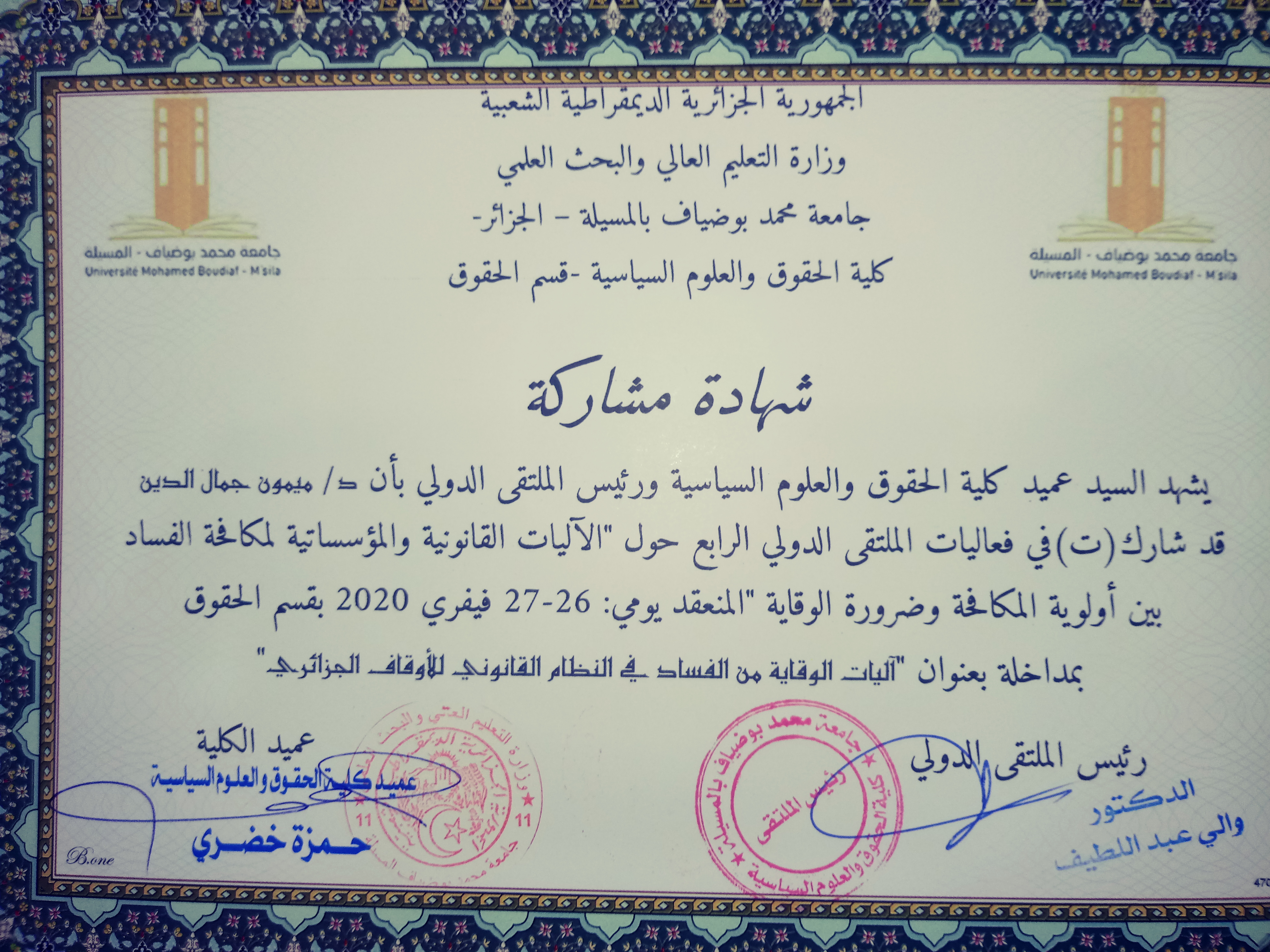 M. DJAMELEDDINE Mimoune, (2022), "ندوة وطنية تكوينية للطلبة المترشحين لمسابقة القضاء", [national] جامعة المسيلة