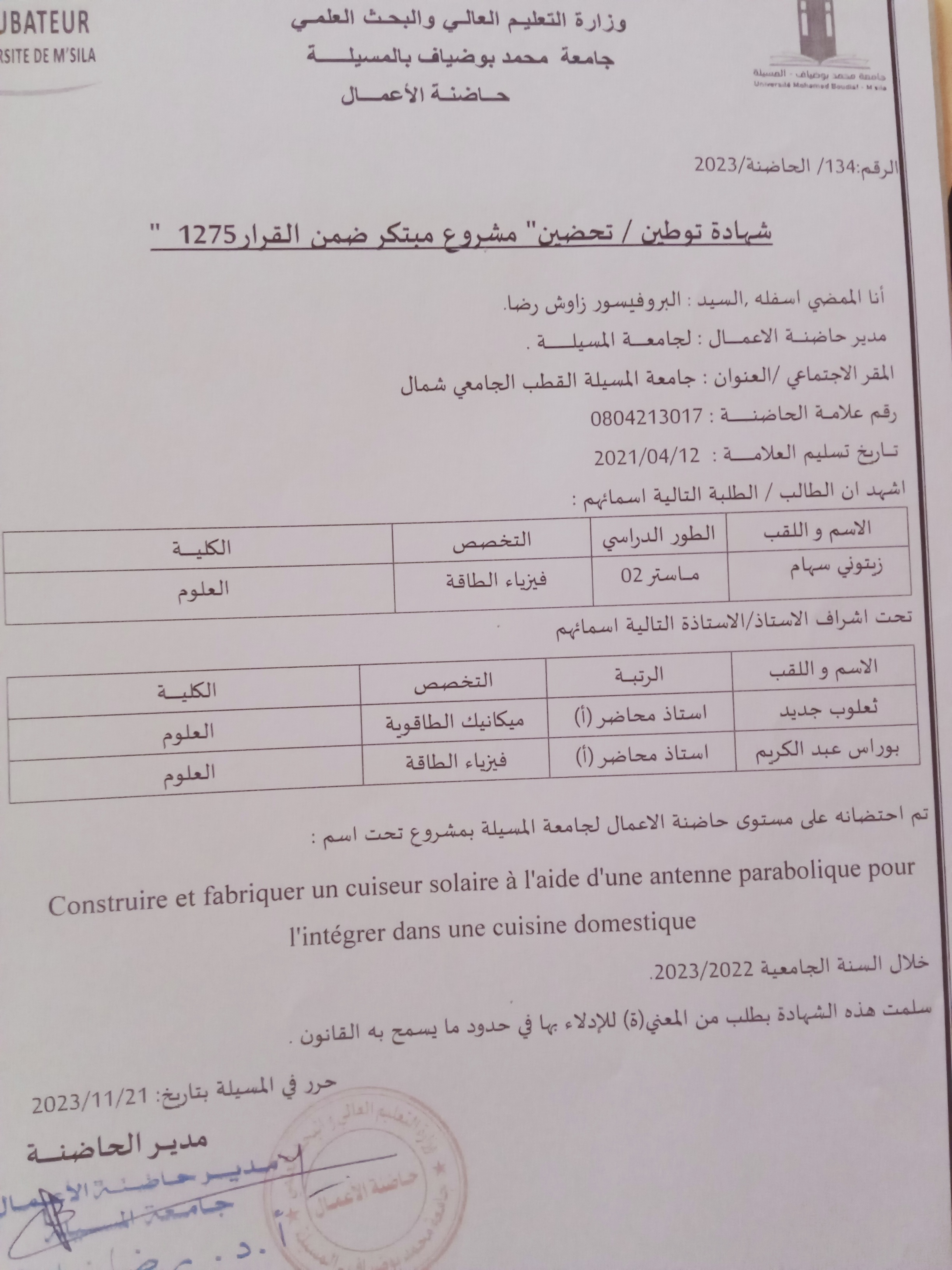 M. TALOUB Djedid, Zitouni Sihame, , (2023-11-12), "Construction et fabrication d'u cuiseur solaire à l'aide d'une antenne parabolique pour l'intégrer dans une cuisine domestique", [national] M'sila Uiversité