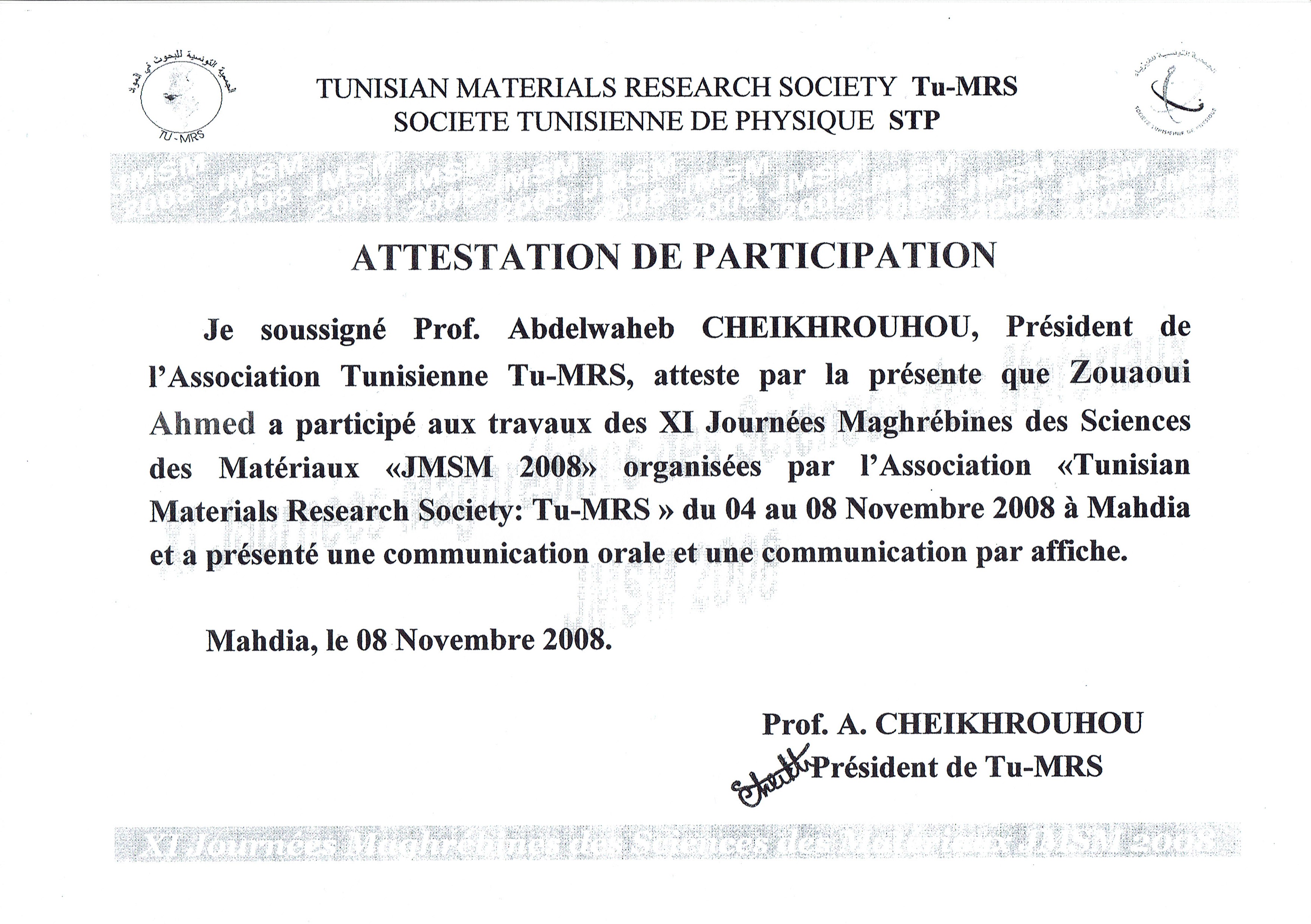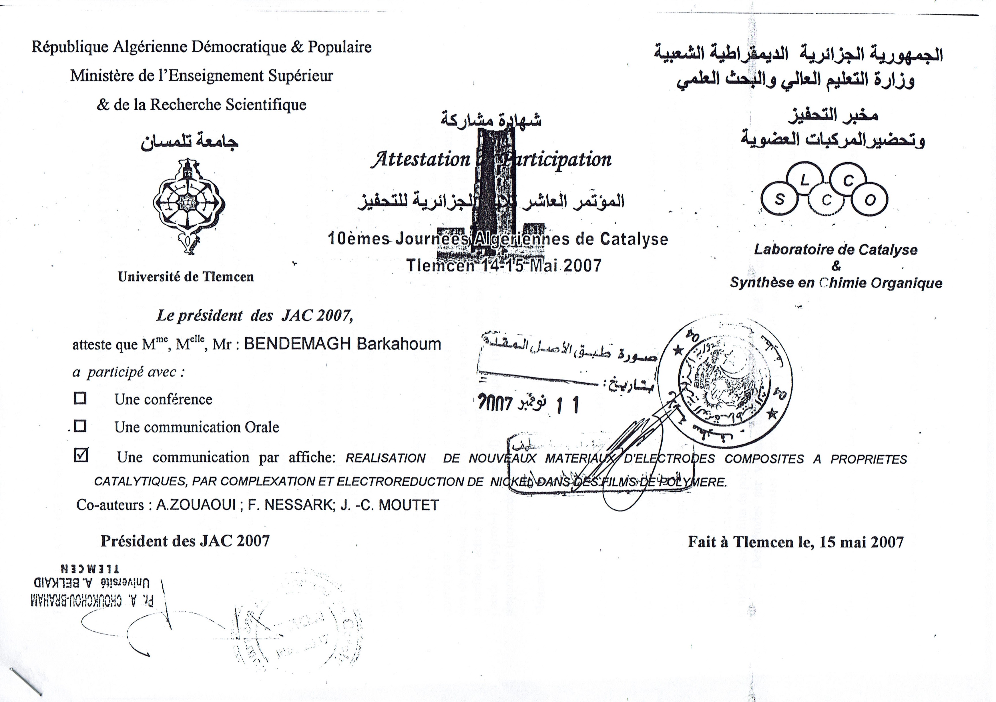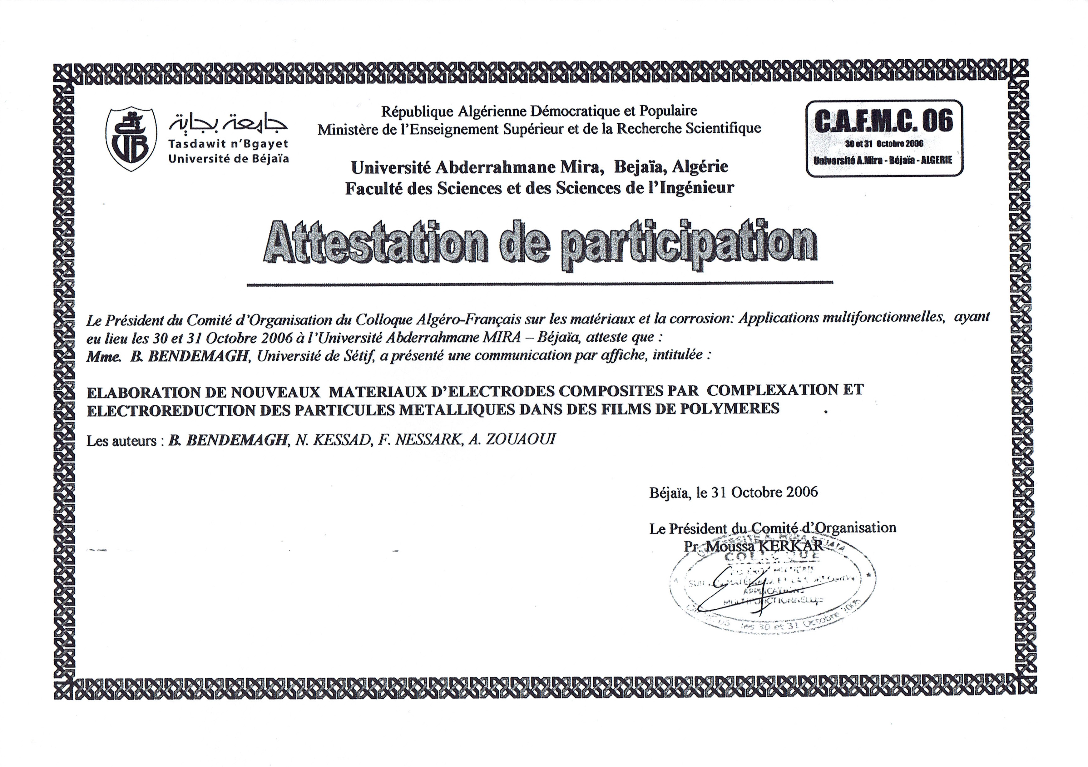 M. NESSARK Faiza, Barkahoum BENDEMAGH, Ahmed ZOUAOUI, Jean-Claude MOUTET, , (2008), "Electrodeposition de métaux de transition (Cu, Co et Cd) sur une électrode de carbone vitreux modifie par un film de polymère", [international] Journées Maghrébines des Sciences des Matériaux (JMSM’2008) , Mahdia, Tunisie