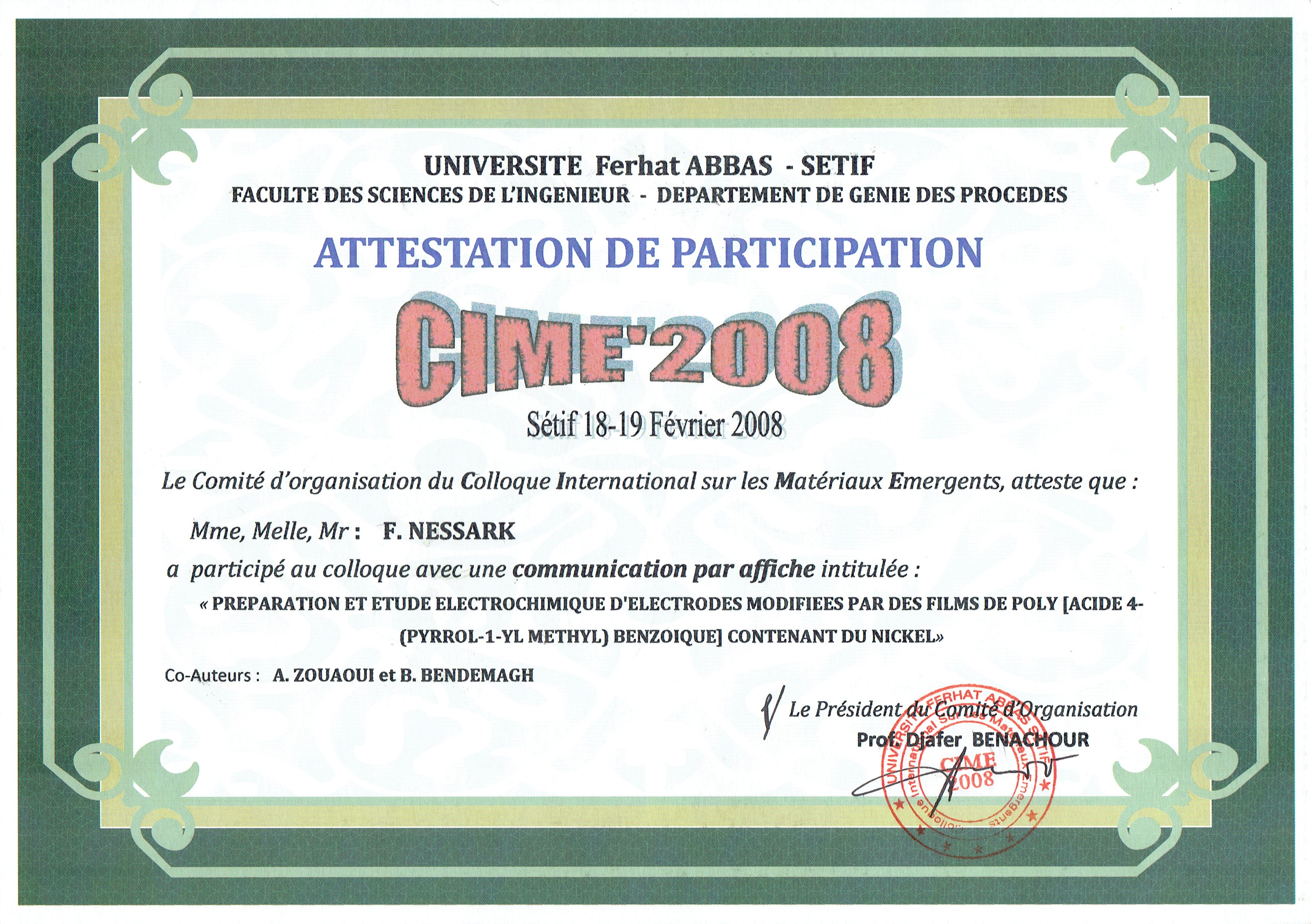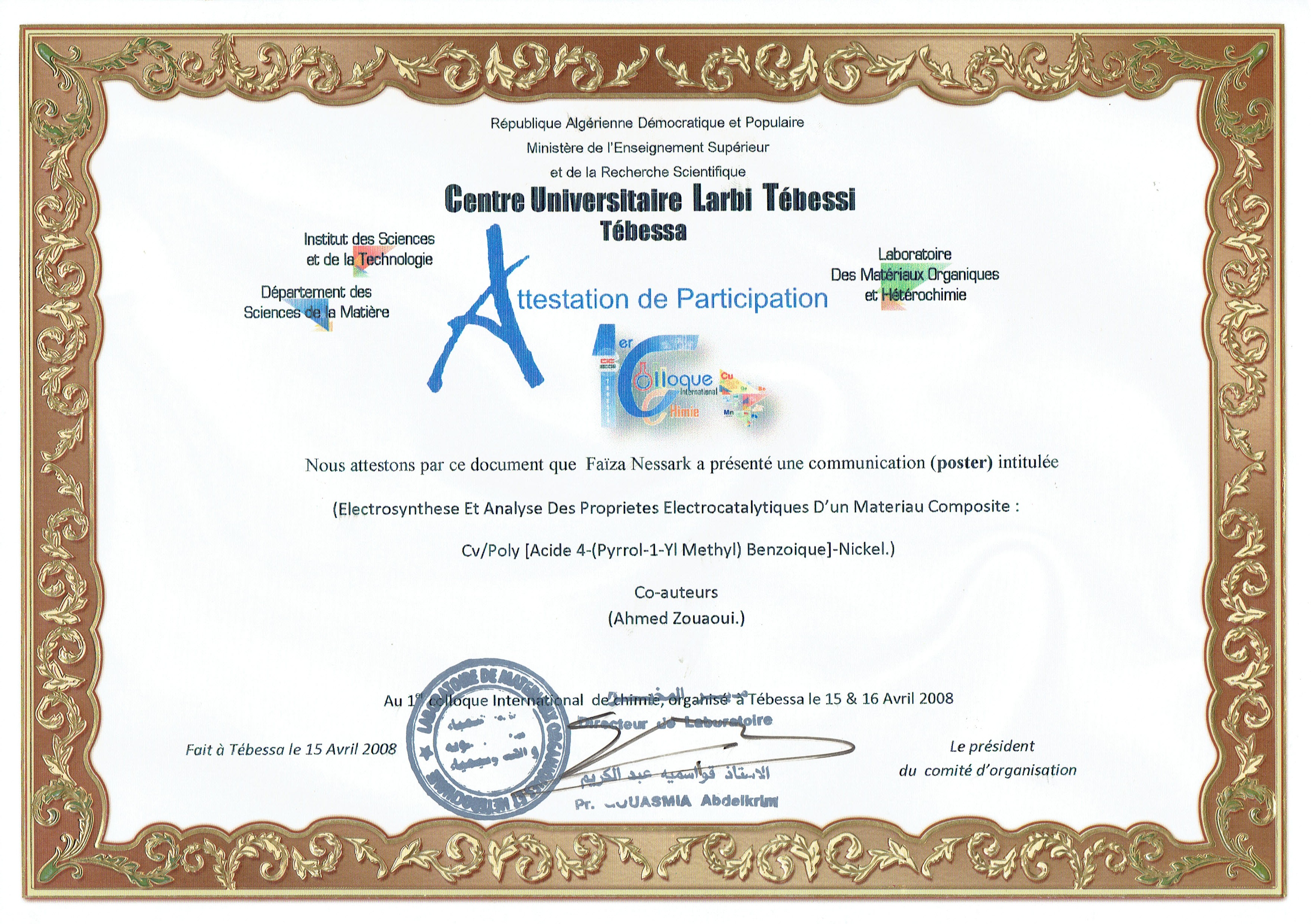 M. NESSARK Faiza, Ahmed ZOUAOUI, , (2008), "Electrosynthèse et analyse des propriétés électrocatalytiques d’un matériau composite : Cv/poly [acide 4-(pyrrol-1-yl méthyl) benzoïque]-Nickel", [international] 1er Colloque International de Chimie , Tébessa, Algérie