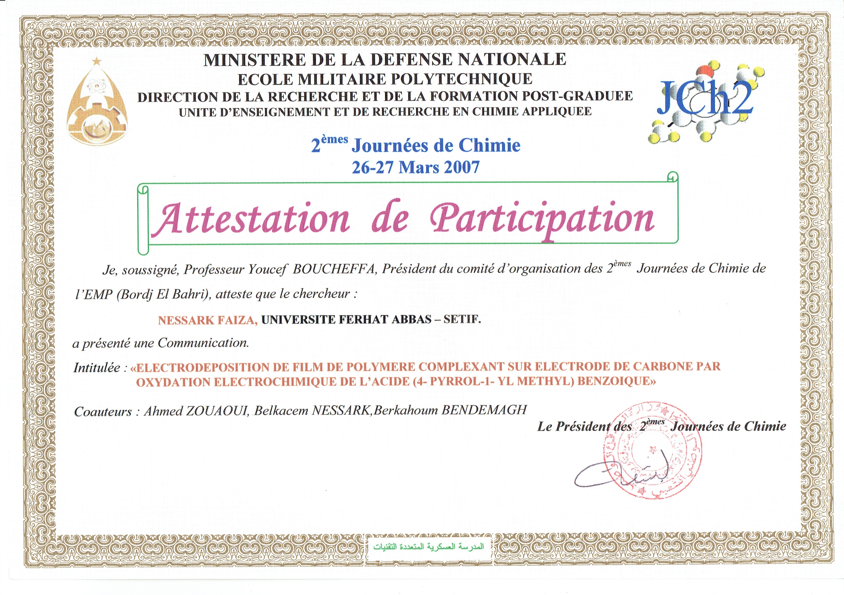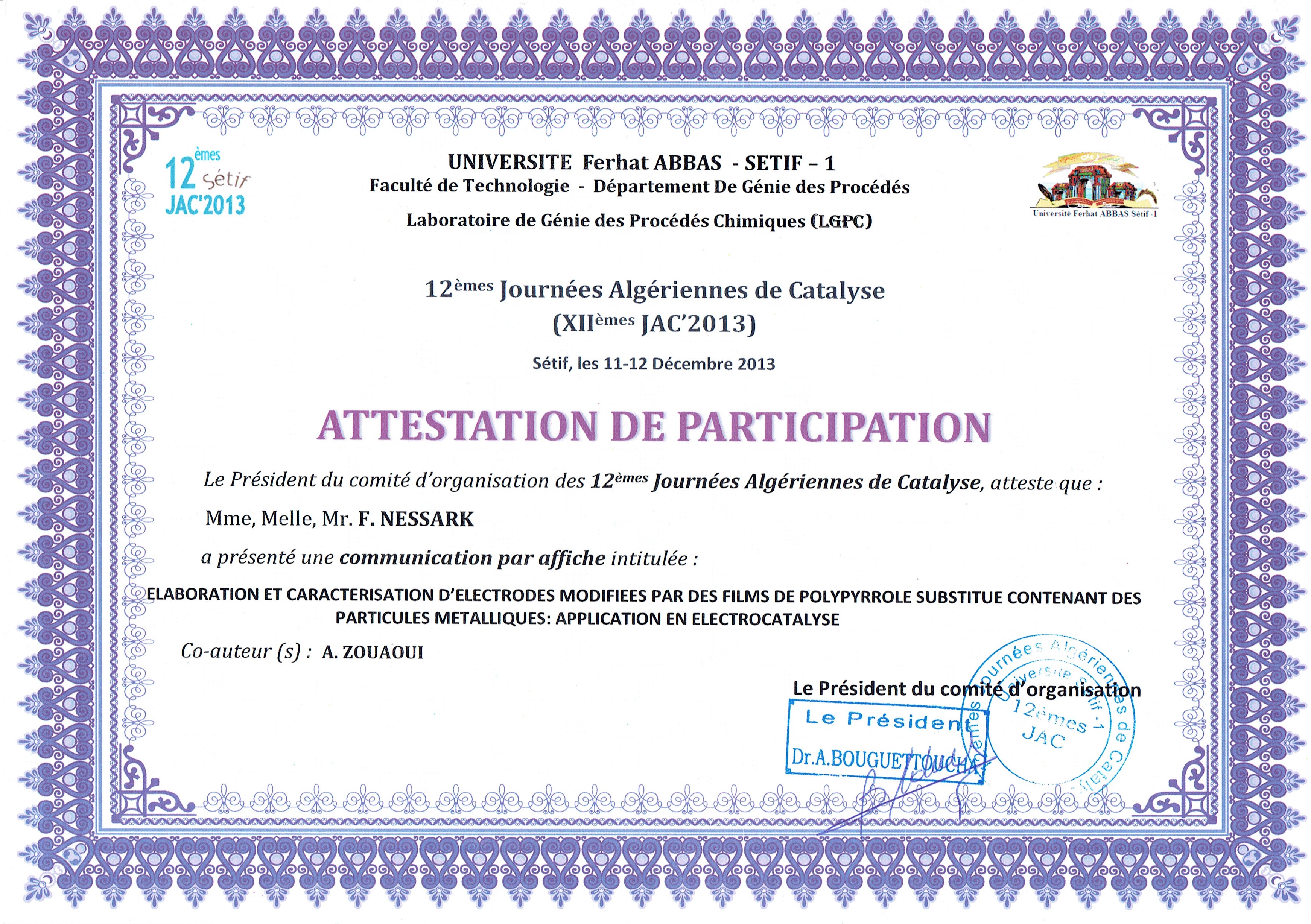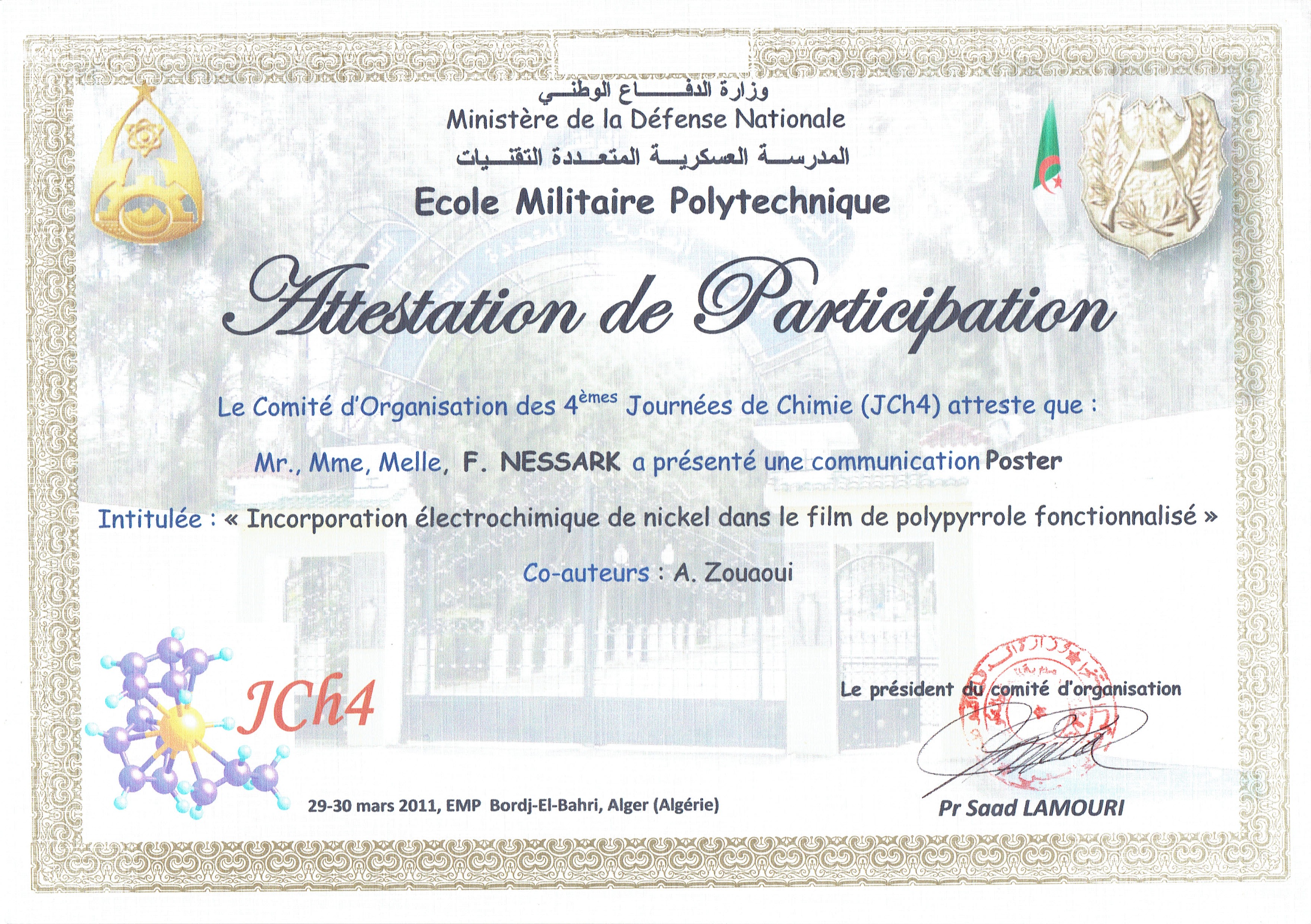 M. NESSARK Faiza, A. ZOUAOUI, , (2013), "Elaboration et caractérisation d’électrodes modifiées par des films de polypyrrole substitue contenant des particules métalliques : application en électrocatalyse", [national] 12ème Journées Algériennes de Catalyse (JAC’2013) , Sétif, Algérie