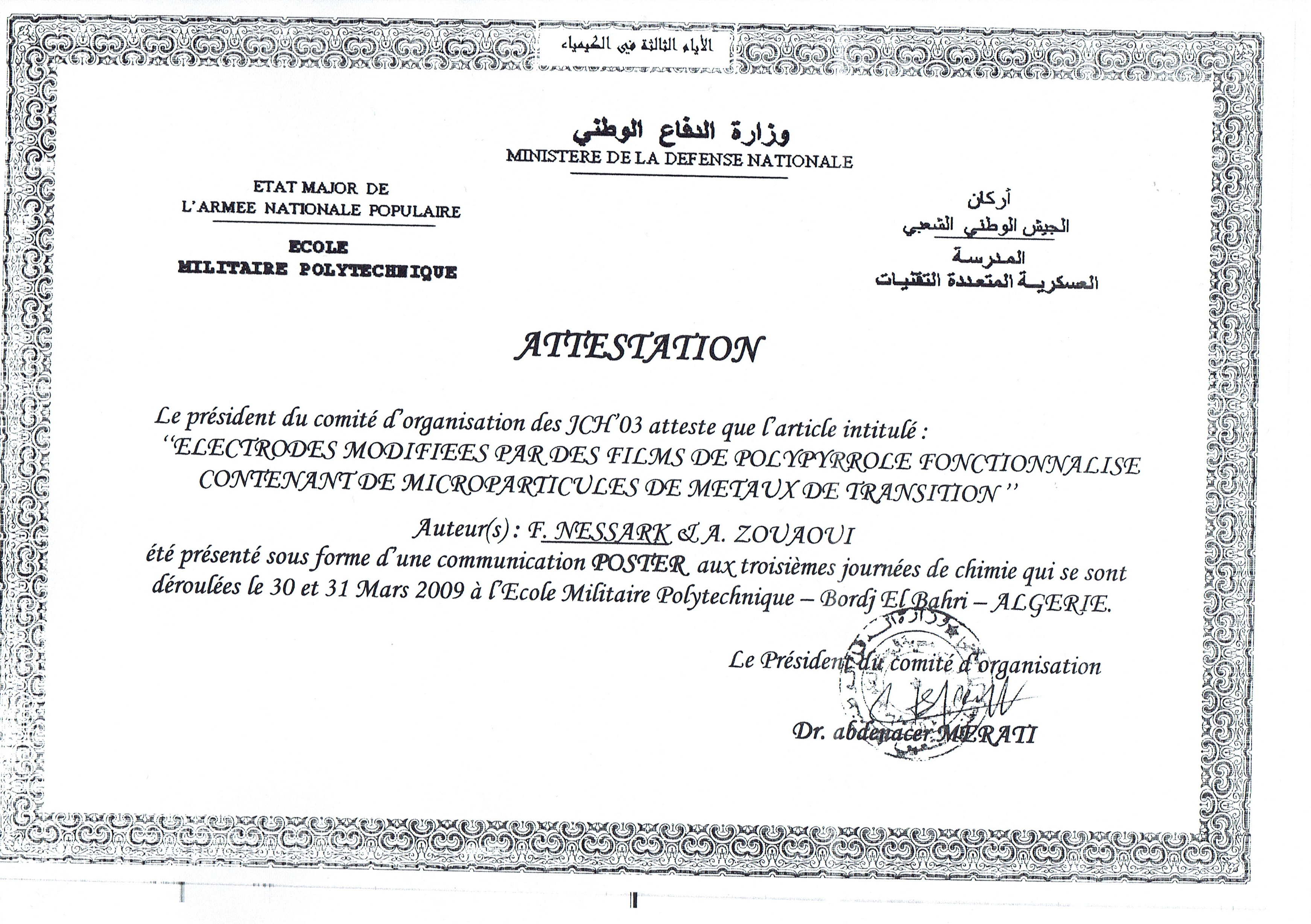 M. NESSARK Faiza, Ahmed ZOUAOUI, , (2009), "Electrodes modifiées par des films de polypyrrole fonctionnalise contenant de microparticules de métaux de transition", [national] 3èmes Journées de Chimie , Bordj El-Bahri, Alger