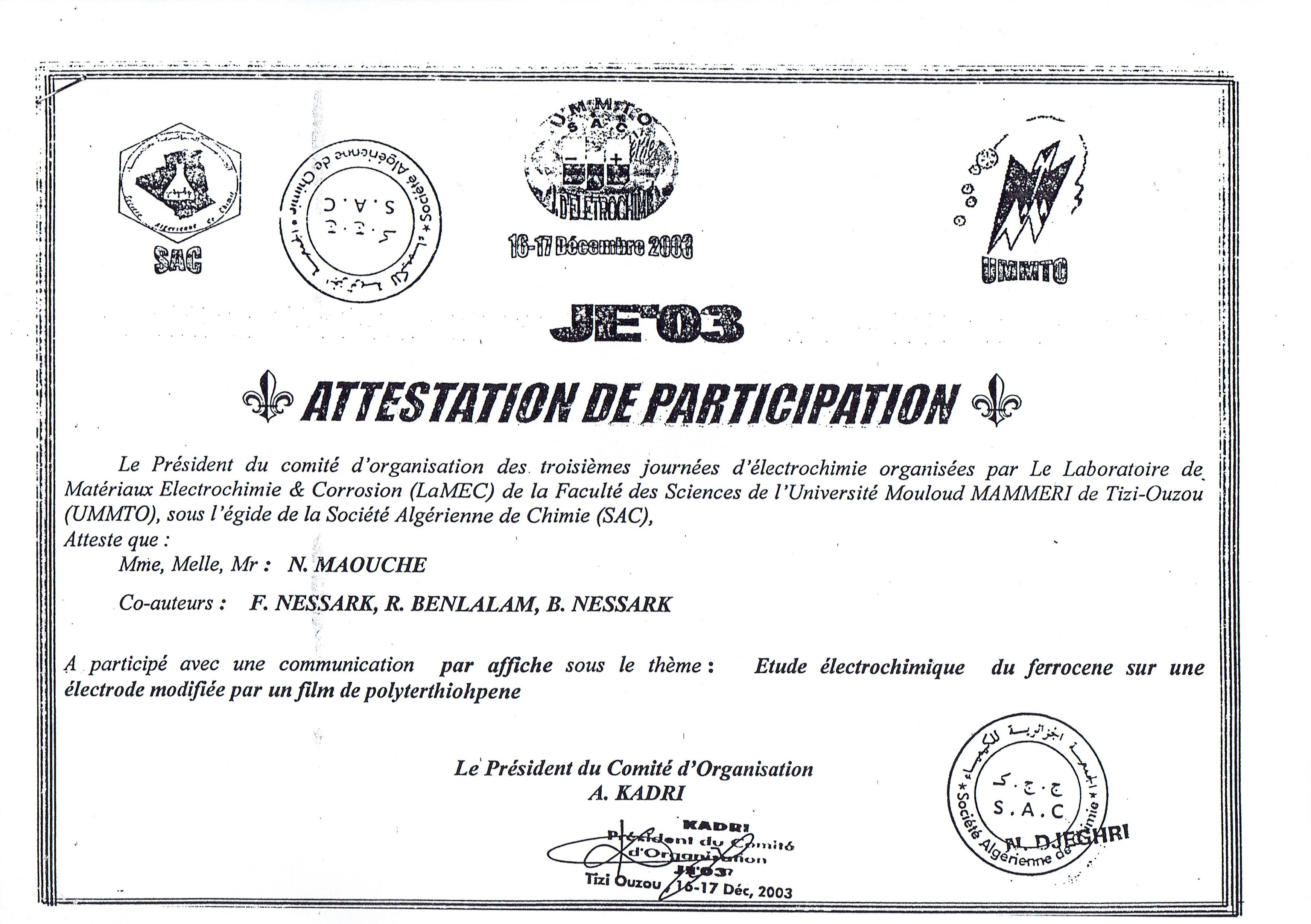 M. NESSARK Faiza, N. MAOUCHE, R. BENLALEM, B. NESSARK, , (2003), "Etude électrochimique du ferrocène sur une électrode modifiée par un film de polybithiophène", [national] 3èmes Journées d'Electrochimie (JE'2003) , Tizi-Ouzou, Algérie
