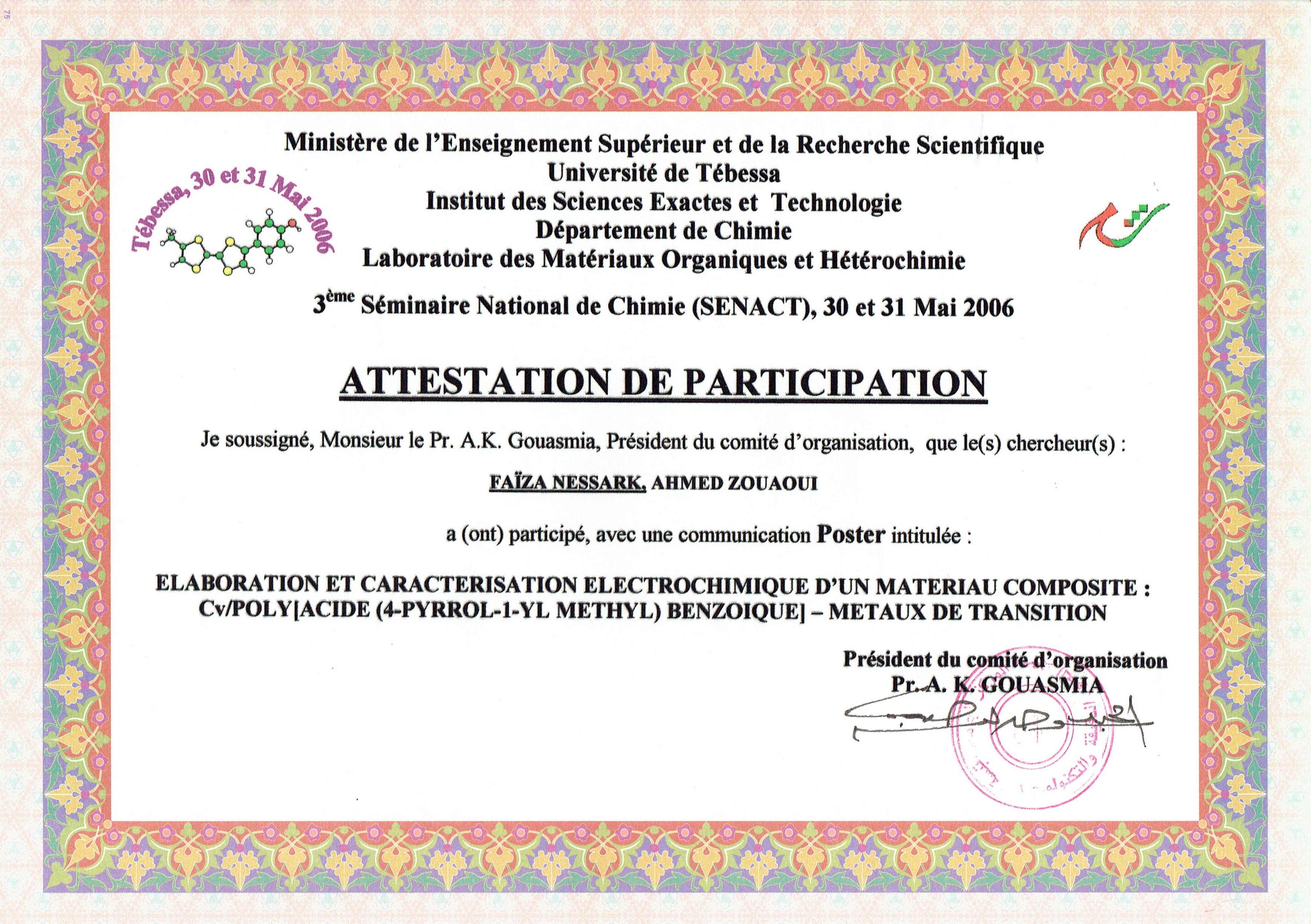 M. NESSARK Faiza, A. ZOUZOUI, , (2006), "Elaboration et caractérisation électrochimique d’un matériau composite : Cv/poly[acide(4-pyrrol-1-yl méthyle) benzoïque] – métaux de transition", [national] 3ème Séminaire National de Chimie (SENACT’2006) , Tébessa, Algérie